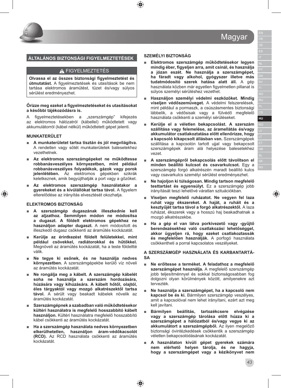Livello di potenza acustica misurato 99 dB(A) Livello di potenza sonora garantita 102 dB(A) Metodo di valutazione sulla conformità all’allegato V Direttiva 2000/14/EC &DWHJRULDTagliare e sfrondare cespugli EN 60745-1:2009+A11:2010, EN 60745-2-15:2009+A1:2010 Uppmätt ljudeffektsnivå 99 dB(A) Garanteret lydeffektniveau 102 dB(A) Overensstemmelsesvurderingsmetode til bilag V Direktiv 2000/14/EC .DWHJRULAt klippe og trimme hække EN 60745-1:2009+A11:2010, EN 60745-2-15:2009+A1:2010 Gemeten geluidsniveau 99 dB(A) 1tYHOGHSRWrQFLDDF~VWLFDJDUDQWLGRG% $ Método de avaliação de conformidade para o anexo V Directiva 2000/14/EC &DWHJRULDCorte e poda de sebes EN 60745-1:2009+A11:2010, EN 60745-2-15:2009+A1:2010 Nível de potência sonora medido 99 dB(A) Gegarandeerd geluidsniveau 102 dB(A)
