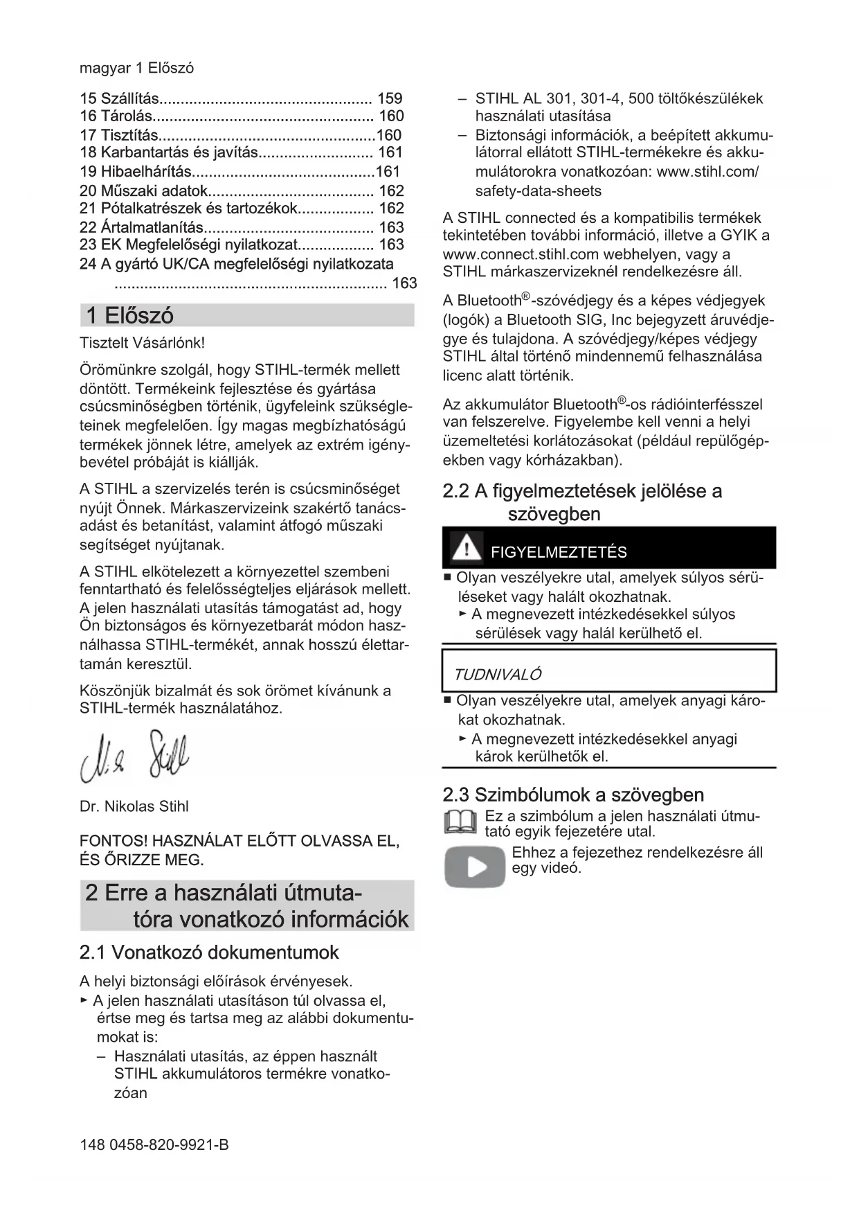 1 Előszó Tisztelt Vásárlónk! Örömünkre szolgál, hogy STIHL-termék mellett döntött. Termékeink fejlesztése és gyártása csúcsminőségben történik, ügyfeleink szükségle‐ teinek megfelelően. Így magas megbízhatóságú termékek jönnek létre, amelyek az extrém igény‐ bevétel próbáját is kiállják. A STIHL a szervizelés terén is csúcsminőséget nyújt Önnek. Márkaszervizeink szakértő tanács‐ adást és betanítást, valamint átfogó műszaki segítséget nyújtanak. A STIHL elkötelezett a környezettel szembeni fenntartható és felelősségteljes eljárások mellett. A jelen használati utasítás támogatást ad, hogy Ön biztonságos és környezetbarát módon hasz‐ nálhassa STIHL-termékét, annak hosszú élettar‐ tamán keresztül. Köszönjük bizalmát és sok örömet kívánunk a STIHL-termék használatához. Dr. Nikolas Stihl FONTOS! HASZNÁLAT ELŐTT OLVASSA EL, ÉS ŐRIZZE MEG. 2 Erre a használati útmuta‐ tóra vonatkozó információk