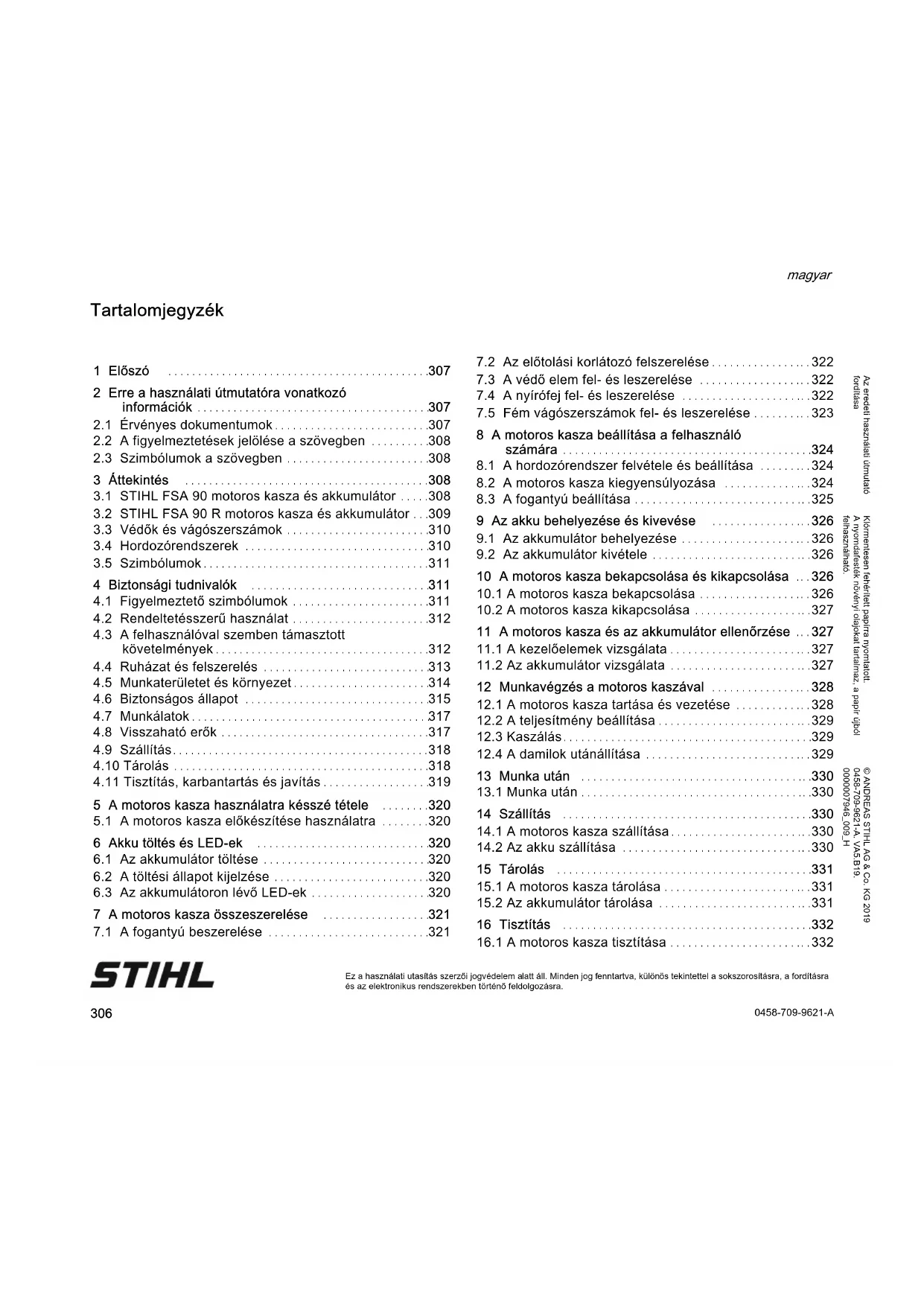 magyar 1 Előszó Tisztelt vevő! Örvendünk, hogy a STIHL mellett döntött. Termékeinket csúcsminőségben fejlesztjük ki és gyártjuk, ügyfelünk szükségleteinek megfelelően. Így nagy megbízhatóságú termékek jönnek létre, extrém igénybevétel esetén is. STIHL a szerviz terén is csúcsminőséget nyújt. Márkaszervizünk kompetens tanácsadást és betanítást, valamint átfogó műszaki segítséget nyújt. Köszönjük bizalmát, és sok örömöt kívánunk a STIHL terméke használatával. Dr. Nikolas Stihl FONTOS! HASZNÁLAT ELŐTT OLVASSA EL ÉS ŐRIZZE MEG.