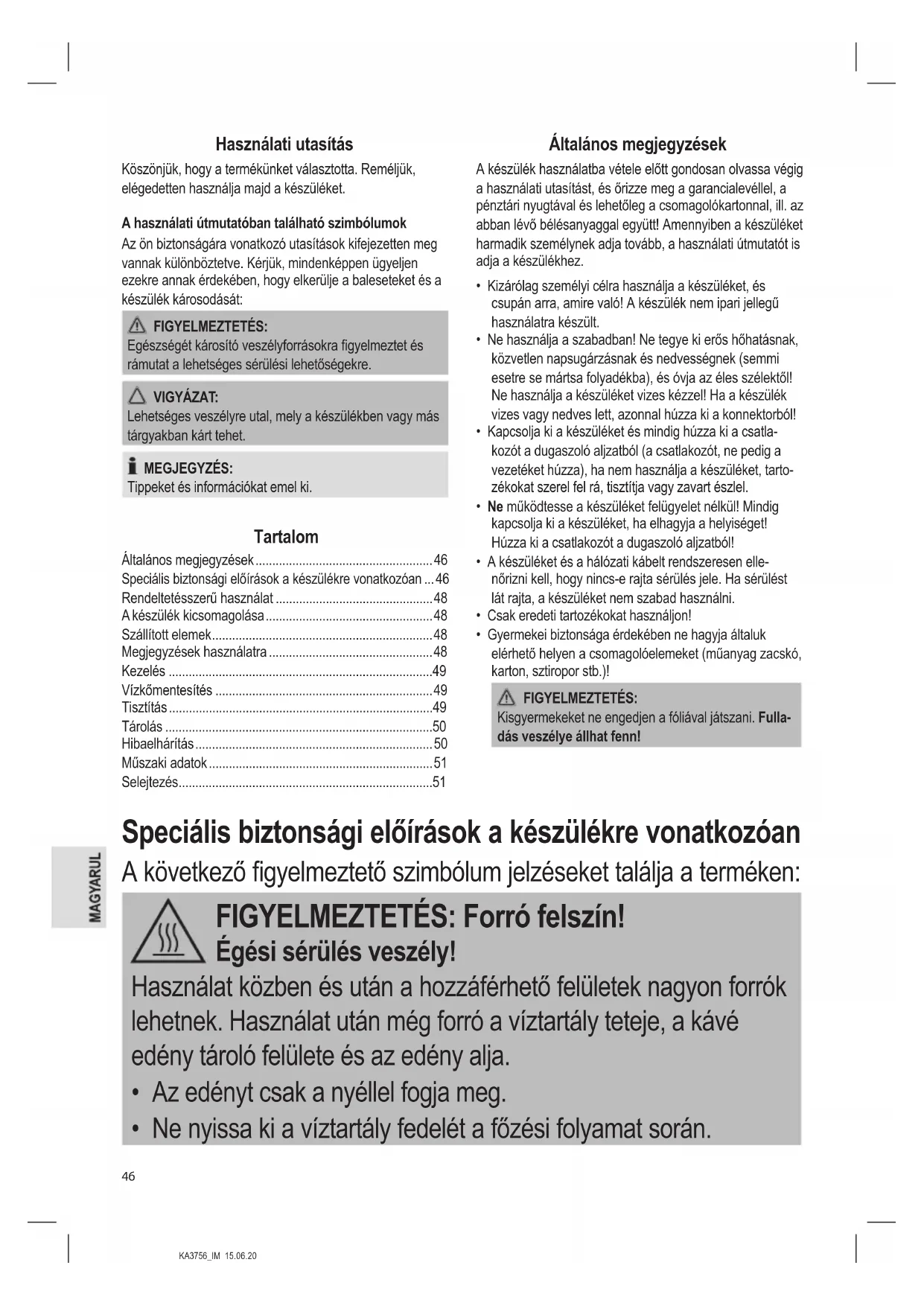 Használati utasítás Köszönjük, hogy a termékünket választotta. Reméljük, elégedetten használja majd a készüléket. A használati útmutatóban található szimbólumok Az ön biztonságára vonatkozó utasítások kifejezetten meg vannak különböztetve. Kérjük, mindenképpen ügyeljen ezekre annak érdekében, hogy elkerülje a baleseteket és a készülék károsodását: FIGYELMEZTETÉS: Egészségét károsító veszélyforrásokra gyelmeztet és rámutat a lehetséges sérülési lehetőségekre. VIGYÁZAT: Lehetséges veszélyre utal, mely a készülékben vagy más tárgyakban kárt tehet. MEGJEGYZÉS: Tippeket és információkat emel ki. Tartalom Általános megjegyzések ..................................................... 46 Speciális biztonsági előírások a készülékre vonatkozóan