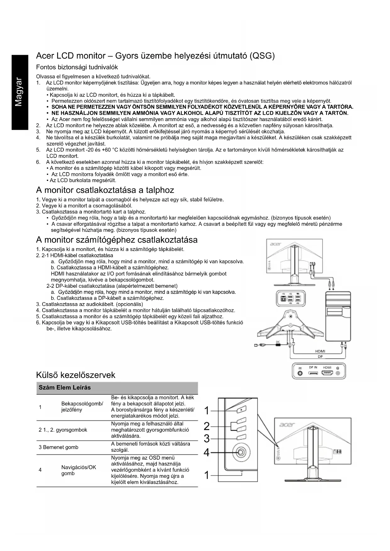 a. Győződjön meg róla, hogy mind a monitor, mind a számítógép ki van kapcsolva. b. Csatlakoztassa a HDMI-kábelt a számítógéphez.HDMI használatakor az I/O port forrásának elindításához bármelyik gombot megnyomhatja, kivéve a bekapcsológombot.2-2 DP-kábel csatlakoztatása (alapértelmezett bemenet) a. Győződjön meg róla, hogy mind a monitor, mind a számítógép ki van kapcsolva. b. Csatlakoztassa a DP-kábelt a számítógéphez.3. Csatlakoztassa az audiokábelt. (opcionális)4. Csatlakoztassa a monitor tápkábelét a monitor hátulján található tápcsatlakozóhoz.5. Csatlakoztassa a monitor és a számítógép tápkábelét egy közeli fali aljzathoz. 6. Kapcsolja be vagy ki a Kikapcsolt USB-töltés beállítást a Kikapcsolt USB-töltés funkció be-, illetve kikapcsolásához. Külső kezelőszervek Szám Elem Leírás