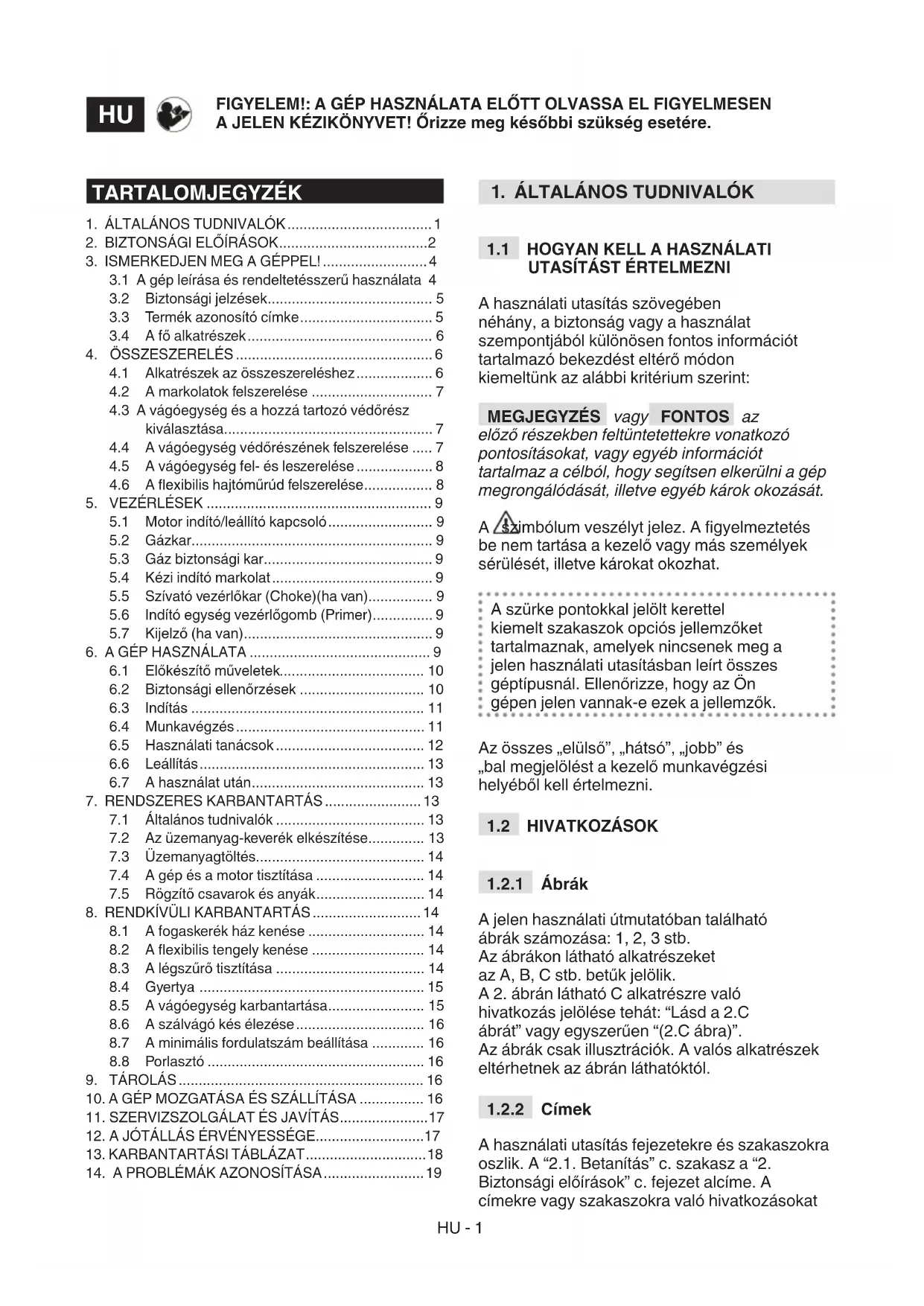 A használati utasítás fejezetekre és szakaszokra oszlik. A “2.1. Betanítás” c. szakasz a “2. Biztonsági előírások” c. fejezet alcíme. A címekre vagy szakaszokra való hivatkozásokat FIGYELEM!: A GÉP HASZNÁLATA ELŐTT OLVASSA EL FIGYELMESEN A JELEN KÉZIKÖNYVET! Őrizze meg későbbi szükség esetére.