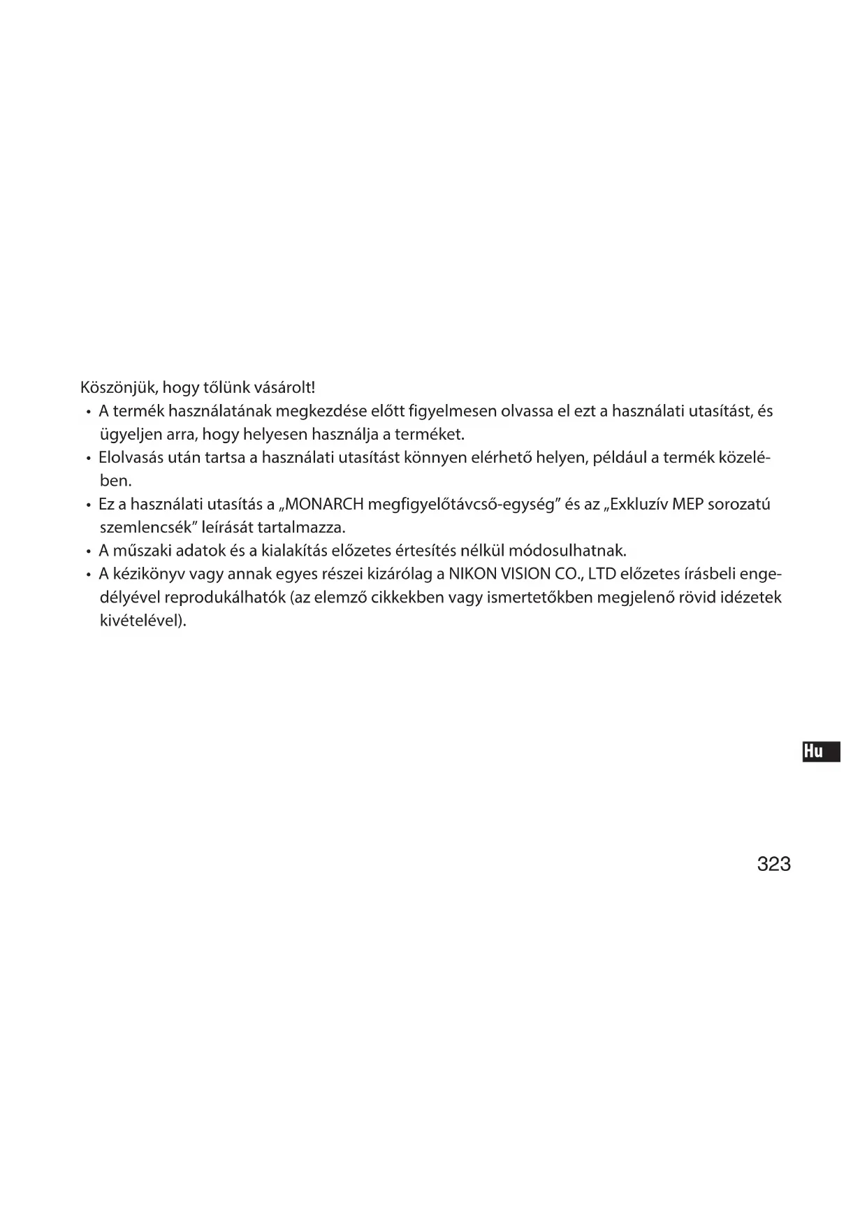 - A kézikönyv vagy annak egyes részei kizárólag a NIKON VISION CO., LTD előzetes írásbeli enge- délyével reprodukálhatók (az elemző cikkekben vagy ismertetőkben megjelenő rövid idézetek kivételével).324