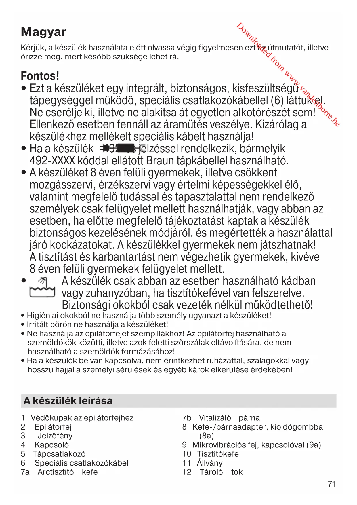 - Bőrnyugtatás céljából az epilálást követően hidratáló krém használata javasolt. Első alkalommal javasolt az esti időszakra időzíteni az epilálást, hogy az esetlegesen fellépő bőrpír másnap reggelre elmúljon. Általános tudnivalók az epilálásról A bőr és a szőrszálak állapotától függően a szőrtüszőből végzett szőrtelenítési módok mindegyike a bőr irritációját okozhatja (pl. viszketés, kellemetlen érzés, bőrpír). Ez normális reakciónak számít, és a tünetek rendszerint gyorsan megszűnnek. Erősebb lehet azonban a reakció, amikor az első néhány alkalommal végez szőrtelenítést a szőrtüszők szintjén, illetve ha érzékeny a bőre. Rendszeres használat esetén általában a bőr reakciója, valamint a fájdalomérzet jelentősen csökken. Amennyiben 36 óra elteltével még mindig fennáll a bőrirritáció, forduljon orvoshoz! A behatoló baktériumok (pl. amikor a készülék a bőrrel érintkezik) által okozott fertőzés vagy gyulladás kockázatának minimalizálása érdekében használat előtt alaposan tisztítsa meg az epilátorfejet és a bőrt! Ha kétségei támadnak a készülék használatával kapcsolatban, konzultáljon orvosával. Az alábbi esetekben kizárólag az orvos előzetes jóváhagyásával használható a készülék: ekcéma, sebek, gyulladásos bőrtünetek (például folliculitis (szőrtüszőgyulladás) és visszerek a szemölcsök környékén), a bőrfelület csökkent immunitása (például cukorbetegség, terhesség, Raynaud-kór, Köbner-jelenség, hemofília vagy immunhiányos állapot miatt). Ha hormonális készítményeket kezd szedni, illetve ha áttér másfajta hormonális készítményre (pl. fogamzásgátló), az hatással lehet a szőrnövekedésre a hormonszint változása miatt. Ezt a hormonháztartás változása idézi elő, nem a készülék. Az arctisztító kefe használata (nedves és száraz használat) Húzza le az epilátorfejet és csatlakoztassa a kefeadaptert (8), majd pattintsa be az arctisztító kefét (7a) vagy a vitalizáló párnát (7b). A tartozék a napi arctisztítás során vízzel, szappannal, arctisztító tejjel, arctisztító géllel vagy arcradírral együtt használható. A vitalizáló párna emellett intenzív masszázst is nyújt, amitől szebb lesz a bőr textúrája. A kefét gyengéden nyomja a bőrére, majd körkörös mozdulatokkal húzza végig rajta. Hagyja ki a szemkörnyéket és a hajvonalat. A mikrovibrációs fej használata Helyezze fel a mikrovibrációs fejet (9). A kapcsoló (9a) balra vagy jobbra csúsztatásával választhat a gyengéd és az intenzív üzemmódok közül. Mindkét üzemmód használható 1-es vagy 2-es sebességfokozattal. A mikrovibrációs fej használatát folyékony bőrápoló termékek alkalmazásához javasoljuk. 91474612_FaceSpa_Pro_910-911-912-913_921_EURO_S4-122.indd 7391474612_FaceSpa_Pro_910-911-912-913_921_EURO_S4-122.indd 73 17.08.17 15:1517.08.17 15:15 CSS APPROVED Effective Date 18Aug2017 GMT - Printed 17Oct2017 Page 73 of 122 Downloaded from www.vandenborre.be74 A finoman érintő mozdulatok biztosítják a bőrápoló termék hatékony és gazdaságos használatát. A mikrovibrációs fejet lassan vezesse végig az arc 3 zónáján (zónánként 20 másodpercig). Tisztítás és karbantartás Használat után az alábbiak szerint végezze a készülék tisztítását: Mikrovibrációs fej (9): A tisztításhoz egy nedves rongyot használjon. Ne mossa el vízben! Epilátorfej (2): A kefével (10) tisztítsa meg óvatosan a csipeszeket. A kefét akár etanolba (70%) is márthatja. Ne mossa el vízben az epilátorfejet! Arctisztító kefe/párna (7,8): Csak ez a tartozék öblíthető el folyó víz alatt. Amennyiben szeretné alaposan megtisztítani szappannal és meleg vízzel, válassza le a kefét/párnát (7a/b) a kioldó gomb (8a) megnyomásával. Az ismételt felhelyezés előtt ügyeljen arra, hogy tisztítás után mindegyik tartozék megszáradjon. A legjobb eredmény érdekében cserélje a kefét/párnát (7a/b) 3 havonta vagy gyakrabban, amennyiben a sörték deformálódnak a gyakori használat miatt. A különféle pótkeféket (hivatkozási szám: 80 Face) az értékesítőknél, a Braun szervizközpontokban, illetve a www.braun.hu/hu-hu weboldalon szerezheti be. Környezetvédelmi nyilatkozat A termék akkumulátorokat és/vagy újrahasznosítható elektromos hulladékot tartalmaz. A környezet védelme érdekében ne dobja ki a háztartási hulladékkal együtt, hanem vigye el az országában megfelelő helyi gyűjtőpontokra újrahasznosítás céljából. A változtatás jogát fenntartjuk Garancia A vásárlás napjától számított 2 évig tartó garanciát biztosítunk a termékre. A garancia- időszakon belül minden anyag- és kivitelezési hibát díjmentesen helyrehozunk, belátásunk szerint vagy javítva, vagy cserélve a készüléket. Ez a garancia minden olyan országra kiterjed, ahol a készülék a Braun vagy annak kijelölt viszonteladója forgalmazásában kapható. A garancia nem fedi a következőket: nem rendeltetésszerű használat miatt bekövetkező károsodás; kopás és elhasználódás (pl. a borotva szita- és vágókazettája); illetve a készülék értéke és működése szempontjából elhanyagolható jellegű hibák. A garancia érvényét veszti, ha a javítást erre nem jogosult személy végzi, és ha nem Braun alkatrészeket használnak. A garancia-időszakon belüli javításhoz adja le vagy küldje el a teljes készüléket a vásárláskor kapott számlával együtt valamely hivatalos Braun Ügyfélszolgálati Szervizközpontnak vagy a vásárlás helyén. 91474612_FaceSpa_Pro_910-911-912-913_921_EURO_S4-122.indd 7491474612_FaceSpa_Pro_910-911-912-913_921_EURO_S4-122.indd 74 17.08.17 15:1517.08.17 15:15 CSS APPROVED Effective Date 18Aug2017 GMT - Printed 17Oct2017 Page 74 of 122 Downloaded from www.vandenborre.be75 Prije upo