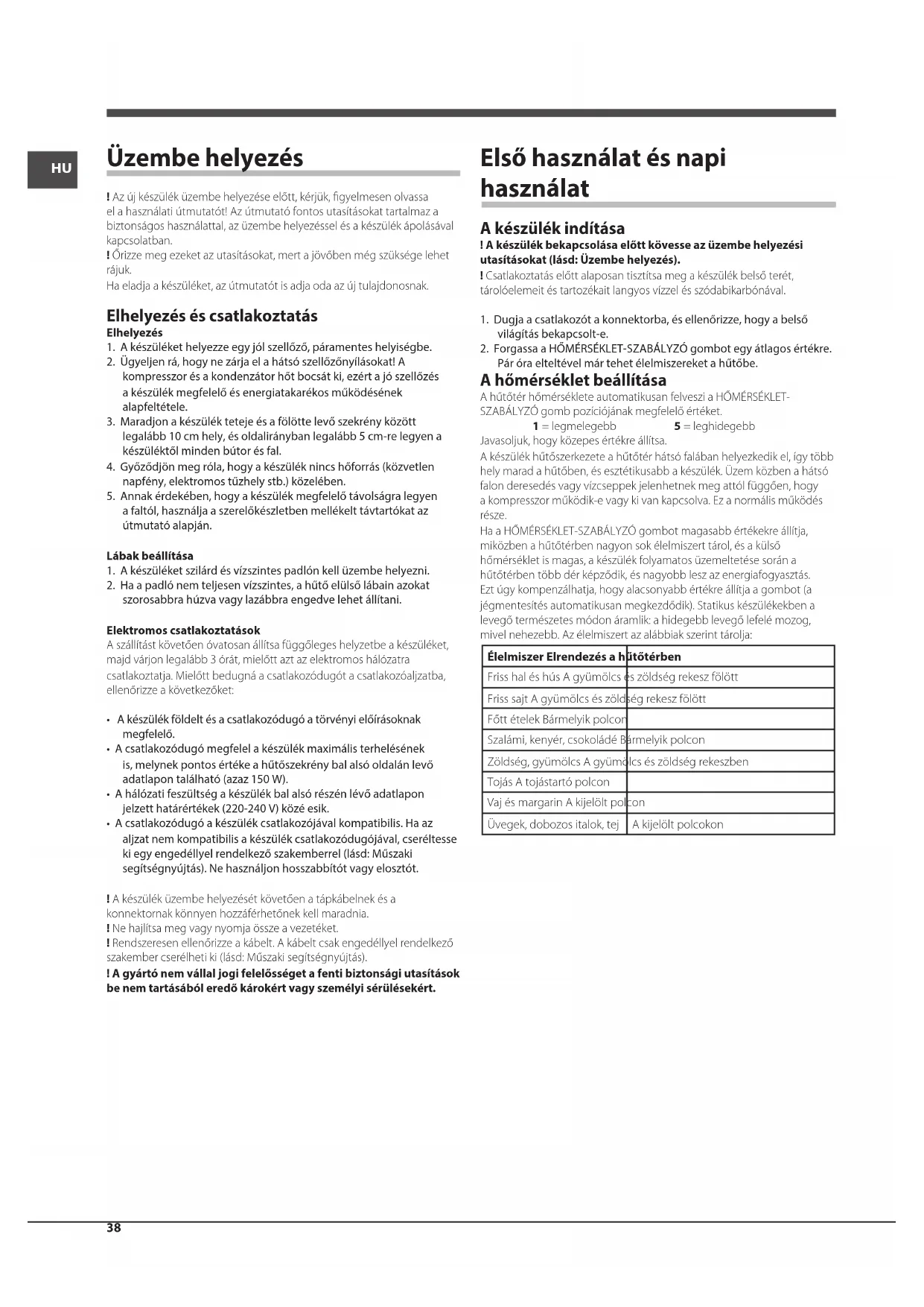 - Az élelmiszereket kizárólag hidegen vagy langyosan tegye a hűtőtérbe, sosem melegen (lásd Figyelmeztetések és tanácsok).