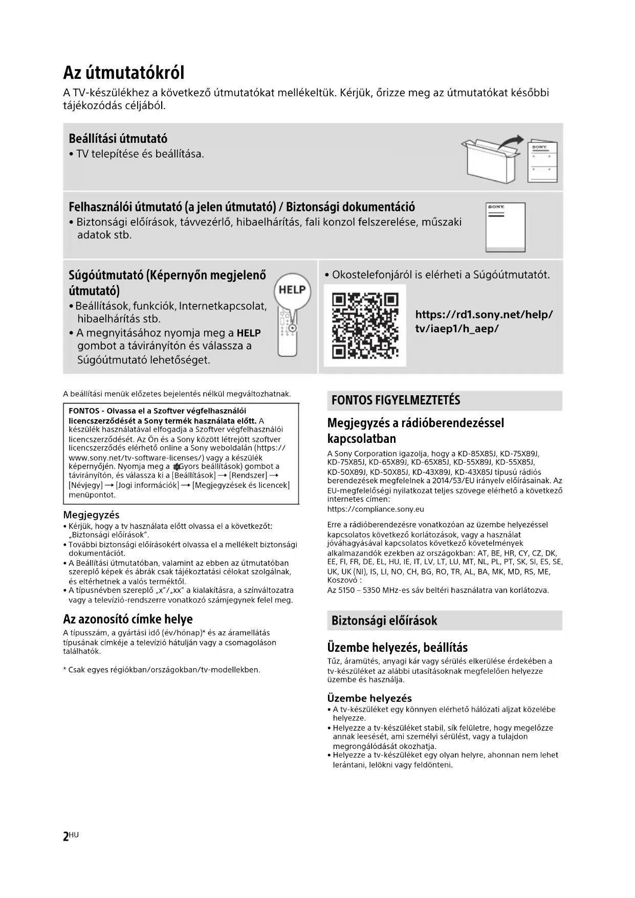 Töltse le az útmutatót a következőhöz Televízió PDF formátumban ingyenesen! Találja meg kézikönyvét KD75X85TJ - SONY és vegye vissza elektronikus eszközét a kezébe. Ezen az oldalon közzé van téve az eszköze használatához szükséges összes dokumentum. KD75X85TJ márka SONY.