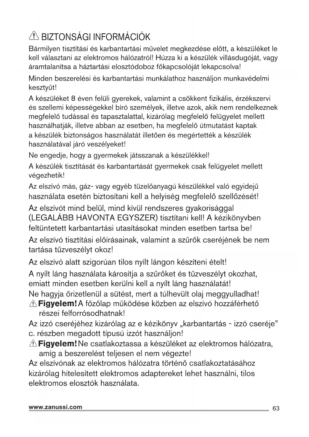 Bármilyen tisztítási és karbantartási művelet megkezdése előtt, a készüléket le kell választani az elektromos hálózatról! Húzza ki a készülék villásdugóját, vagy áramtalanítsa a háztartási elosztódoboz főkapcsolóját lekapcsolva! Minden beszerelési és karbantartási munkálathoz használjon munkavédelmi kesztyűt! A készüléket 8 éven felüli gyerekek, valamint a csökkent fizikális, érzékszervi és szellemi képességekkel bíró személyek, illetve azok, akik nem rendelkeznek megfelelő tudással és tapasztalattal, kizárólag megfelelő felügyelet mellett használhatják, illetve abban az esetben, ha megfelelő útmutatást kaptak a készülék biztonságos használatát illetően és megértették a készülék használatával járó veszélyeket! Ne engedje, hogy a gyermekek játsszanak a készülékkel! A készülék tisztítását és karbantartását gyermekek csak felügyelet mellett végezhetik! Az elszívó más, gáz- vagy egyéb tüzelőanyagú készülékkel való egyidejű használata esetén biztosítani kell a helyiség megfelelő szellőzését! Az elszívót mind belül, mind kívül rendszeres gyakorisággal (LEGALÁBB HAVONTA EGYSZER) tisztítani kell! A kézikönyvben feltüntetett karbantartási utasításokat minden esetben tartsa be! Az elszívó tisztítási előírásainak, valamint a szűrők cseréjének be nem tartása tűzveszélyt okoz! Az elszívó alatt szigorúan tilos nyílt lángon készíteni ételt! A nyílt láng használata károsítja a szűrőket és tűzveszélyt okozhat, emiatt minden esetben kerülni kell a nyílt láng használatát! Ne hagyja őrizetlenül a sütést, mert a túlhevült olaj meggyulladhat! Figyelem! A főzőlap működése közben az elszívó hozzáférhető részei felforrósodhatnak! Az izzó cseréjéhez kizárólag az e kézikönyv „karbantartás - izzó cseréje” c. részben megadott típusú izzót használjon! Figyelem! Ne csatlakoztassa a készüléket az elektromos hálózatra, amíg a beszerelést teljesen el nem végezte! Az elszívónak az elektromos hálózatra történő csatlakoztatásához kizárólag hitelesített elektromos adaptereket lehet használni, tilos elektromos elosztók használata.64 www.zanussi.com