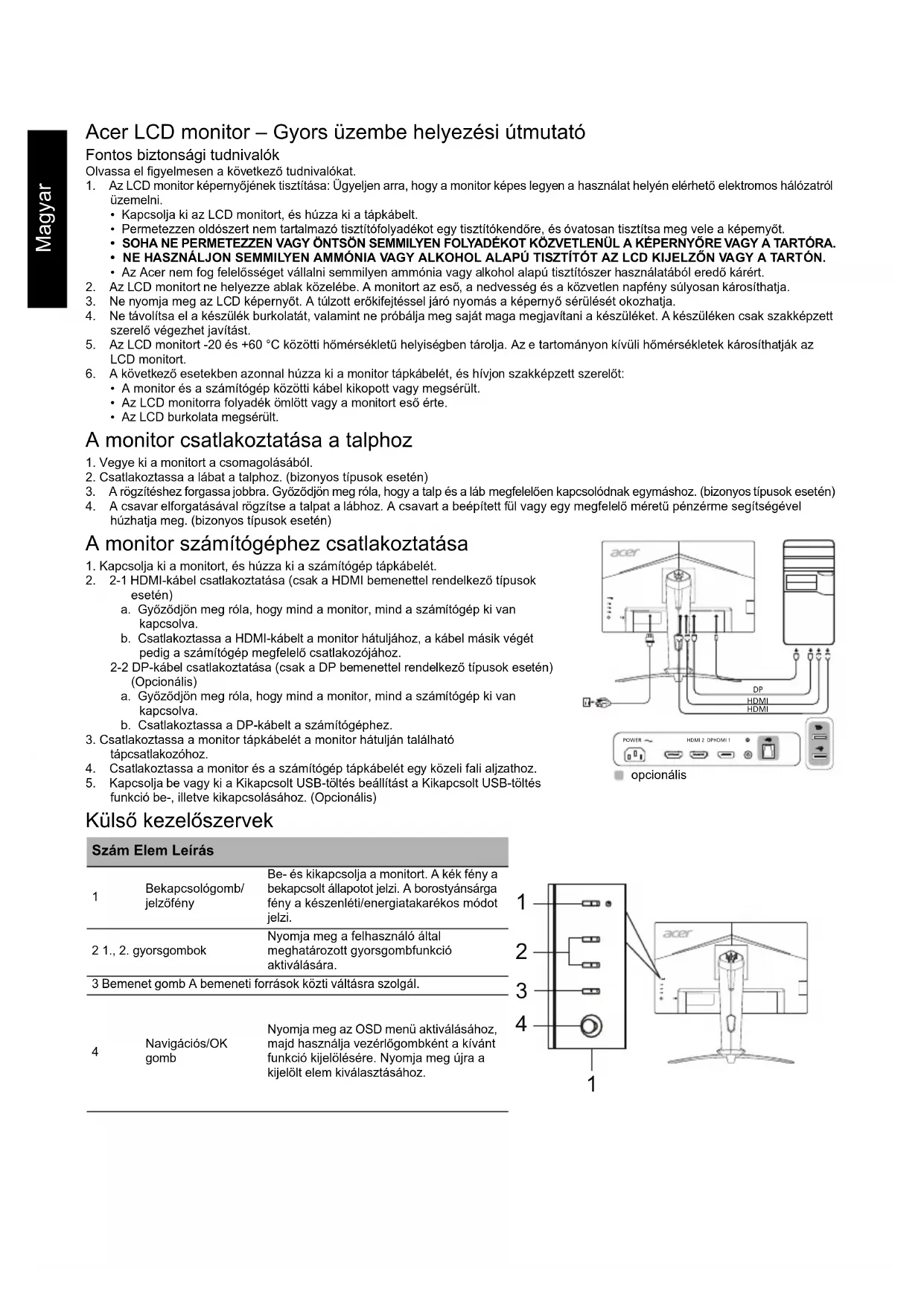 Bemenet Menü/Navigációs/OK Funkciók Fényerő Kontraszt Kék fény Sötét élénkítése ACM HDR Szuper élesség Gamma Színhőmérséklet Módok Színtér Szürkeárnyalatos mód 6 tengelyes színárnyalat 6 tengelyes telítettség Hangerő Némítás Túlhajtás Adaptive-Sync Frissítési frekvencia száma VRB Rendkívül alacsony késleltetés Célzópont Nyelv OSD időkorlátja Átlátszóság OSD zár Bemenet Környezeti fény Automatikus forrás DP-formátum Gyorsgomb hozzárendelése Széles mód DDC/CI HDMI Feketeszint Gyorsindítás mód Túlhúzás# USB-töltés kikapcsolt állapotban Kijelzőinformációk Állítsa vissza az összes beállítást Kilépés A műszaki adatok típusonként és/vagy régiónként eltérőek lehetnek.Ελληνικά Οδηγός γρήγορης εγκατάστασης οθόνης LCD Acer (ΟΓΕ) Σημαντικές οδηγίες ασφαλείας ∆ιαβάστε προσεκτικά τις ακόλουθες οδηγίες. 1. Για να καθαρίσετε την οθόνη LCD: Βεβαιωθείτε ότι η οθόνη σας είναι ηλεκτρικά χαρακτηρισμένη για λειτουργία με το εναλλασσόμενο ρεύμα που είναι διαθέσιμο στην περιοχή σας.