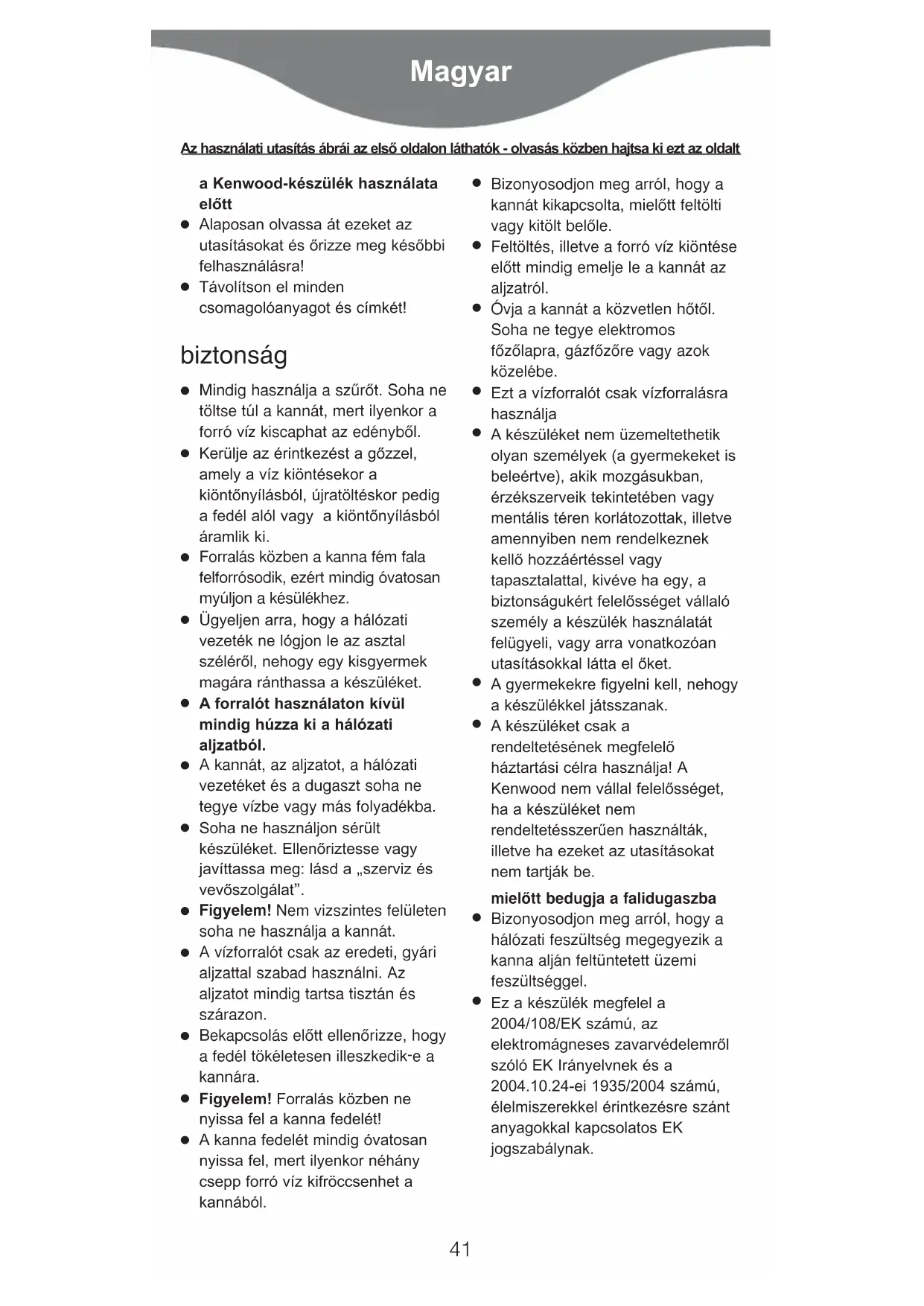 ÉRTELMÉBEN A hasznos élettartamának végére érkezett készüléket nem szabad a lakossági hulladékkal együtt kezelni. A leselejtezett termék az önkormányzatok által kijelölt szelektív hulladékgyűjtőkben (hulladékgyűjtő udvar) vagy az elhasználódott készülékek visszavételét vęgoző kereskedőknél adható le. Az elektromos háztartási készülékek szelektiv gyűjtése és kezelése lehetővé teszi a nem megfelelően végzett hulladékkezelésből adódó, a kömyezetet és az egészséget veszélyeztető negatív hatások megelőzését és a készülék alkotórészeinek újrahaszonsítását, melynek révén jelentős energia-és erőforrás-megtakarítás érhető el. Az elektromos háztartási készülékek szelektív gyűjtésére és kezelésére vonatkozó kötelezettséget a terméken feltüntetett áthúzott szemétgyűjtő edény (kerekes kuka) jelzés mutatja. 43przed użyciem urządzenia Kenwood