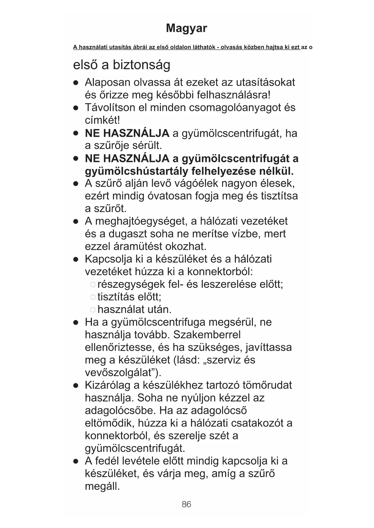 A használati utasítás ábrái az első oldalon láthatók - olvasás közben hajtsa ki ezt az oldalt Magyar● Ügyeljen arra, hogy a hálózati vezeték ne érhessen forró felülethez, és ne lógjon le az asztal széléről, nehogy egy kisgyermek leránthassa a készüléket.