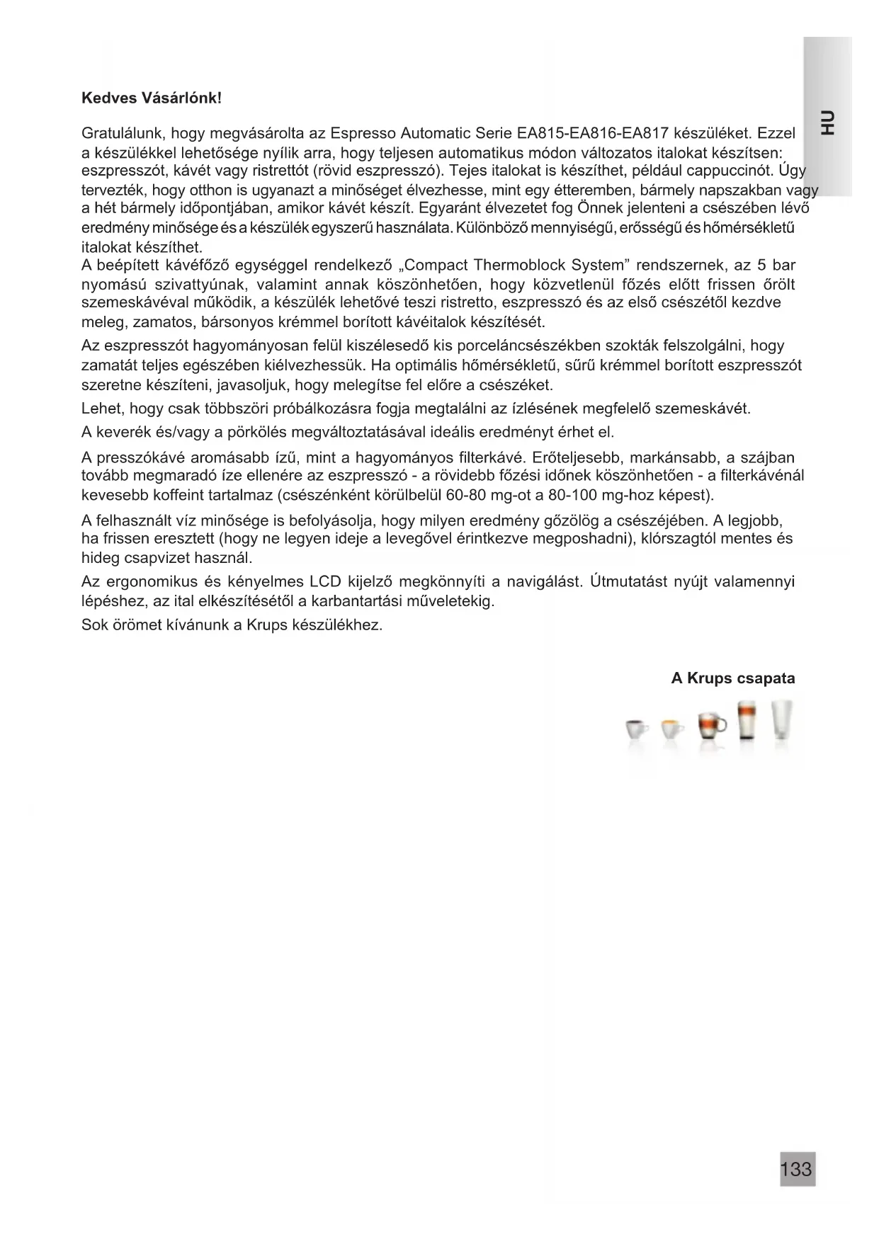 KedvesVásárlónk! Gratulálunk, hogy megvásárolta az Espresso Automatic Serie EA815-EA816-EA817 készüléket. Ezzel a készülékkel lehetősége nyílik arra, hogy teljesen automatikus módon változatos italokat készítsen: eszpresszót, kávét vagy ristrettót (rövid eszpresszó). Tejes italokat is készíthet, például cappuccinót. Úgy tervezték, hogy otthon is ugyanazt a minőséget élvezhesse, mint egy étteremben, bármely napszakban vagy a hét bármely időpontjában, amikor kávét készít. Egyaránt élvezetet fog Önnek jelenteni a csészében lévő eredmény minősége és a készülék egyszerű használata. Különböző mennyiségű, erősségű és hőmérsékletű italokat készíthet. A beépített kávéfőző egységgel rendelkező „Compact Thermoblock System” rendszernek, az 5 bar nyomású szivattyúnak, valamint annak köszönhetően, hogy közvetlenül főzés előtt frissen őrölt szemeskávéval működik, a készülék lehetővé teszi ristretto, eszpresszó és az első csészétől kezdve meleg, zamatos, bársonyos krémmel borított kávéitalok készítését. Az eszpresszót hagyományosan felül kiszélesedő kis porceláncsészékben szokták felszolgálni, hogy zamatát teljes egészében kiélvezhessük. Ha optimális hőmérsékletű, sűrű krémmel borított eszpresszót szeretne készíteni, javasoljuk, hogy melegítse fel előre a csészéket. Lehet, hogy csak többszöri próbálkozásra fogja megtalálni az ízlésének megfelelő szemeskávét. A keverék és/vagy a pörkölés megváltoztatásával ideális eredményt érhet el. A presszókávé aromásabb ízű, mint a hagyományos filterkávé. Erőteljesebb, markánsabb, a szájban tovább megmaradó íze ellenére az eszpresszó - a rövidebb főzési időnek köszönhetően - a filterkávénál kevesebb koffeint tartalmaz (csészénként körülbelül 60-80 mg-ot a 80-100 mg-hoz képest). A felhasznált víz minősége is befolyásolja, hogy milyen eredmény gőzölög a csészéjében. A legjobb, ha frissen eresztett (hogy ne legyen ideje a levegővel érintkezve megposhadni), klórszagtól mentes és hideg csapvizet használ. Az ergonomikus és kényelmes LCD kijelző megkönnyíti a navigálást. Útmutatást nyújt valamennyi lépéshez, az ital elkészítésétől a karbantartási műveletekig. Sok örömet kívánunk a Krups készülékhez. A Krups csapata134 A FUNKCIÓBILLENYTŰK ÉS GOMBOK JELENTÉSE