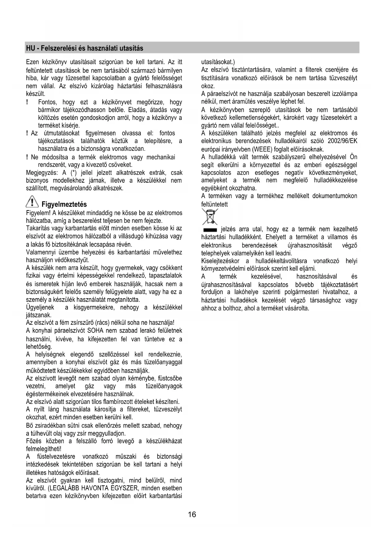 Jos valaistus ei toimi, tarkista että lamput on asennettu oikein paikoilleen ennen kuin otat yhteyttä tekniseen tukeen.16 HU - Felszerelési és használati utasítás Ezen kézikönyv utasításait szigorúan be kell tartani. Az itt feltüntetett utasítások be nem tartásából származó bármilyen hiba, kár vagy tűzesettel kapcsolatban a gyártó felelősséget nem vállal. Az elszívó kizárólag háztartási felhasználásra készült. ! Fontos, hogy ezt a kézikönyvet megőrizze, hogy bármikor tájékozódhasson belőle. Eladás, átadás vagy költözés esetén gondoskodjon arról, hogy a kézikönyv a terméket kísérje. ! Az útmutatásokat figyelmesen olvassa el: fontos tájékoztatások találhatók köztük a telepítésre, a használatra és a biztonságra vonatkozóan. ! Ne módosítsa a termék elektromos vagy mechanikai rendszerét, vagy a kivezető csöveket. Megjegyzés: A (*) jellel jelzett alkatrészek extrák, csak bizonyos modellekhez járnak, illetve a készülékkel nem szállított, megvásárolandó alkatrészek. Figyelmeztetés Figyelem! A készüléket mindaddig ne kösse be az elektromos hálózatba, amíg a beszerelést teljesen be nem fejezte. Takarítás vagy karbantartás előtt minden esetben kösse ki az elszívót az elektromos hálózatból a villásdugó kihúzása vagy a lakás fő biztosítékának lecsapása révén. Valamennyi üzembe helyezési és karbantartási művelethez használjon védőkesztyűt. A készülék nem arra készült, hogy gyermekek, vagy csökkent fizikai vagy értelmi képességekkel rendelkező, tapasztalatok és ismeretek híján levő emberek használják, hacsak nem a biztonságukért felelős személy felügyelete alatt, vagy ha ez a személy a készülék használatát megtanította. Ügyeljenek a kisgyermekekre, nehogy a készülékkel játszanak. Az elszívót a fém zsírszűrő (rács) nélkül soha ne használja! A konyhai páraelszívót SOHA nem szabad lerakó felületnek használni, kivéve, ha kifejezetten fel van tüntetve ez a lehetőség. A helyiségnek elegendő szellőzéssel kell rendelkeznie, amennyiben a konyhai elszívót gáz és más tüzelőanyaggal működtetett készülékekkel egyidőben használják. Az elszívott levegőt nem szabad olyan kéménybe, füstcsőbe vezetni, amelyet gáz vagy más tüzelőanyagok égéstermékeinek elvezetésére használnak. Az elszívó alatt szigorúan tilos flambírozott ételeket készíteni. A nyílt láng használata károsítja a filtereket, tűzveszélyt okozhat, ezért minden esetben kerülni kell. Bő zsiradékban sütni csak ellenőrzés mellett szabad, nehogy a túlhevült olaj vagy zsír meggyulladjon. Főzés közben a felszálló forró levegő a készülékházat felmelegítheti! A füstelvezetésre vonatkozó műszaki és biztonsági intézkedések tekintetében szigorúan be kell tartani a helyi illetékes hatóságok előírásait. Az elszívót gyakran kell tisztogatni, mind belülről, mind kívülről. (LEGALÁBB HAVONTA EGYSZER, minden esetben betartva ezen kézikönyvben kifejezetten előírt karbantartási utasításokat.) Az elszívó tisztántartására, valamint a filterek cseréjére és tisztítására vonatkozó előírások be nem tartása tűzveszélyt okoz. A páraelszívót ne használja szabályosan beszerelt izzólámpa nélkül, mert áramütés veszélye léphet fel. A kézikönyvben szereplő utasítások be nem tartásából következő kellemetlenségekért, károkért vagy tűzesetekért a gyártó nem vállal felel ősséget.. A készüléken található jelzés megfelel az elektromos és elektronikus berendezések hulladékairól szóló 2002/96/EK európai irányelvben (WEEE) foglalt előírásoknak. A hulladékká vált termék szabályszerű elhelyezésével Ön segít elkerülni a környezettel és az emberi egészséggel kapcsolatos azon esetleges negatív következményeket, amelyeket a termék nem megfelelő hulladékkezelése egyébként okozhatna. A terméken vagy a termékhez mellékelt dokumentumokon feltüntetett jelzés arra utal, hogy ez a termék nem kezelhető háztartási hulladékként. Ehelyett a terméket a villamos és elektronikus berendezések újrahasznosítását végző telephelyek valamelyikén kell leadni. Kiselejtezéskor a hulladékeltávolításra vonatkozó helyi környezetvédelmi előírások szerint kell eljárni. A termék kezelésével, hasznosításával és újrahasznosításával kapcsolatos bővebb tájékoztatásért forduljon a lakóhelye szerinti polgármesteri hivatalhoz, a háztartási hulladékok kezelését végző társasághoz vagy ahhoz a bolthoz, ahol a terméket vásárolta.17 Használat Az elszívót úgy tervezték, hogy kivezetett üzemmódban a szabadba történő kibocsátással, vagy filteres, keringtetett üzemmódban működhessen. Kivezetett üzemmód Az elszívó a füst szabadba kivezetéséhez rendelkezik egy felső B kivezetőnyílással (Kivezetett változat – kivezető cső és rögzítő kengyel nem jár a készülékhez). ábra 1 Szűrős változat Amennyiben a sütő gőz- és füst kültérbe vezetése nem lehetséges, úgy a szűrős változatű elszívó használható 1 vagy 2 aktív szénfilter felhelyezésével (*). A föüst és gőz így a konyhába kerül visszaforgatásra. ábra 2 Az elszívó motor nélküli modellek csak kivezetett változatban működnek és külső elszívó egységhez (ez nem jár a készülékhez) kell kötni őket. A bekötési útmutató az elszívó egységhez van mellékelve. Felszerelés ábra 3-4-5-6-7-8-9-10 A főzőkészülék felülete és a konyhai szagelszívó legalsó része közötti minimális távolság nem lehet kisebb, mint 50cm elektromos főzőlap, és 65cm gáz vagy vegyes tüzelésű főzőlap esetén. Ha a gázfőzőlap beszerelési utasításában ennél nagyobb távolság szerepel, azt kellfigyelembe venni. Villamos bekötés A hálózati feszültségnek azonosnak kell lennie a ko