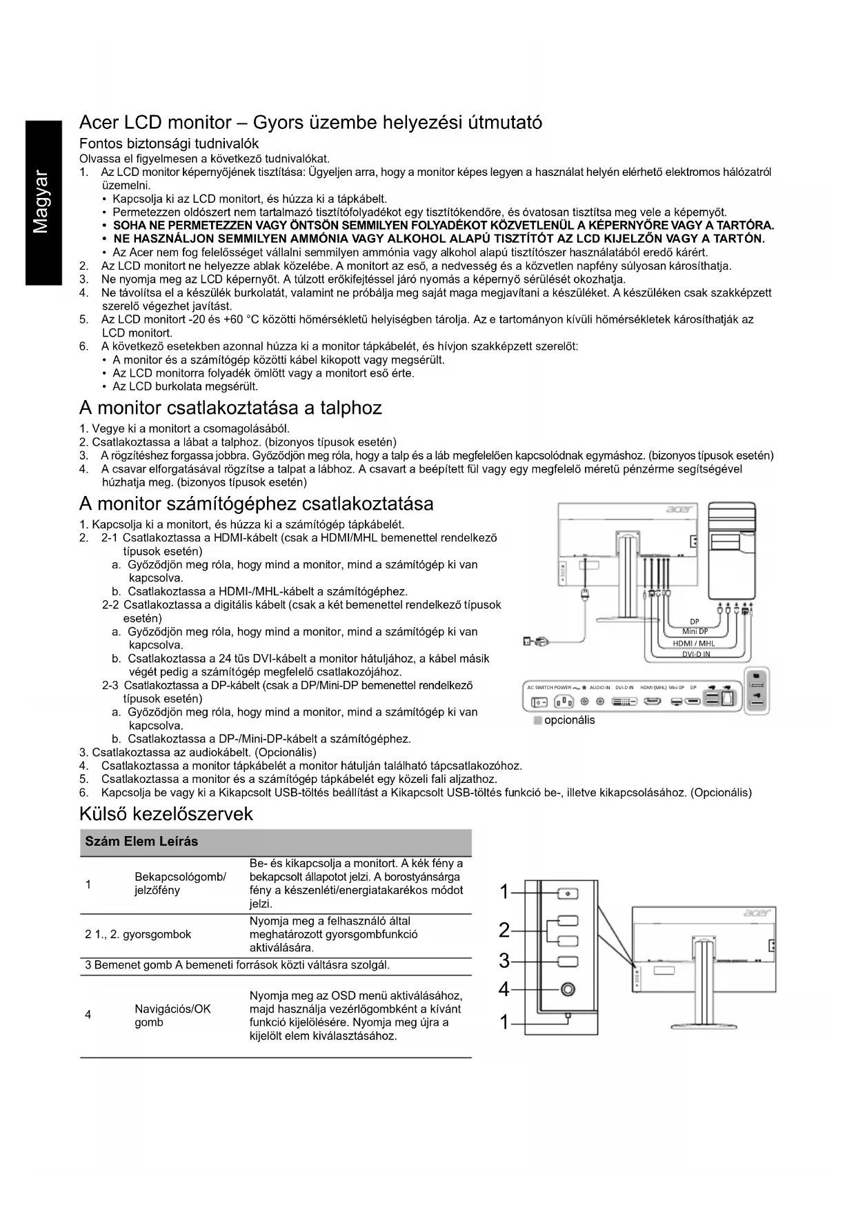 Bemenet Menü/Navigációs/OK Funkciók Kontraszt Fényerő Fókusz (csak az analóg bemenetű típuson) Órajel (csak az analóg bemenetű típuson) Vízszintes pozíció (csak az analóg bemenetű típuson) Függőleges pozíció (csak az analóg bemenetű típuson) Szuper élesség 6 tengelyes telítettség 6 tengelyes színárnyalat Gamma Színhőmérséklet sRGB/Adobe RGB/Rec.709 PIP/PBP Acer eColor Management Kék fény DP-formátum USB-töltés kikapcsolt állapotban Nyelv OSD időkorlátja Automatikus konfiguráció (csak az analóg bemenetű típuson) Széles mód (teljes/arány) ACM be/ki Bemeneti jel kiválasztása Automatikus forrás Gyorsindítás mód Egységesség Átlátszóság Gyorsgomb hozzárendelése Beállítás mentése A műszaki adatok értesítés nélkül változhatnak.Ελληνικά Οδηγός γρήγορης εγκατάστασης οθόνης LCD Acer (ΟΓΕ) Σημαντικές οδηγίες ασφαλείας ∆ιαβάστε προσεκτικά τις ακόλουθες οδηγίες. 1. Για να καθαρίσετε την οθόνη LCD: Βεβαιωθείτε ότι η οθόνη σας είναι ηλεκτρικά χαρακτηρισμένη για λειτουργία με το εναλλασσόμενο ρεύμα που είναι διαθέσιμο στην περιοχή σας.