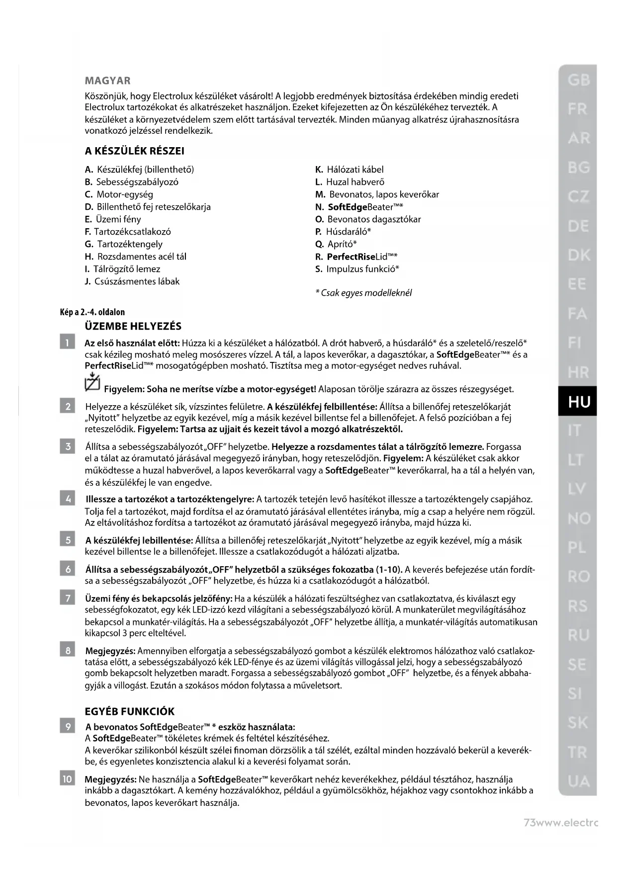 MAGYAR Köszönjük, hogy Electrolux készüléket vásárolt! A legjobb eredmények biztosítása érdekében mindig eredeti Electrolux tartozékokat és alkatrészeket használjon. Ezeket kifejezetten az Ön készülékéhez tervezték. A készüléket a környezetvédelem szem előtt tartásával tervezték. Minden műanyag alkatrész újrahasznosításra vonatkozó jelzéssel rendelkezik. A KÉSZÜLÉK RÉSZEI A. Készülékfej (billenthető) B. Sebességszabályozó C. Motor-egység D. Billenthető fej reteszelőkarja E. Üzemi fény F. Tartozékcsatlakozó G. Tartozéktengely H. Rozsdamentes acél tál
