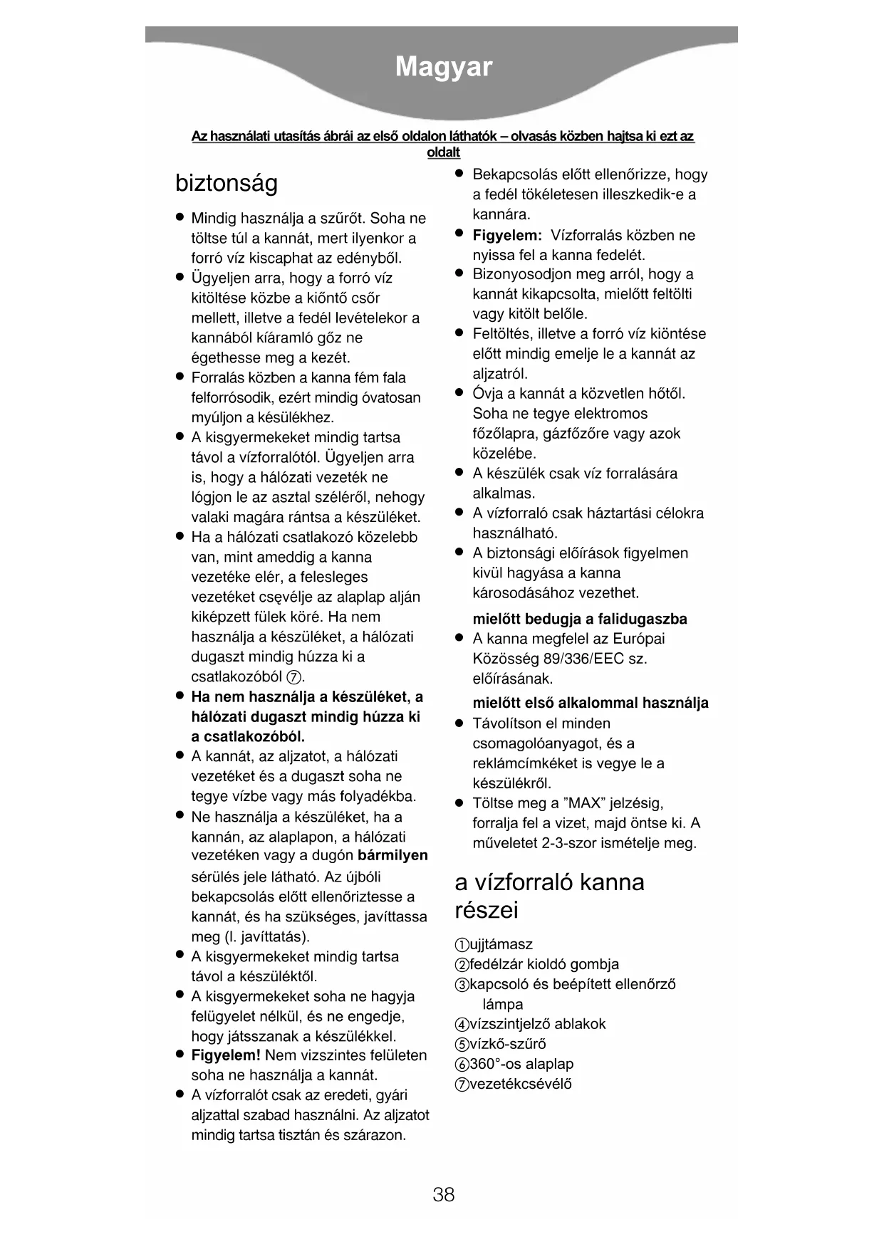 Magyar Az használati utasítás ábrái az elsò oldalon láthatók – olvasás közben hajtsa ki ezt az oldalta rozsdamentes acél vízforraló kanna használata 1 A fedő felnyitásához húzza hátra a fedő kioldókapcsolóját . A vízszintnek a ‘MAX’ és a ‘MIN’ jelzések között kell lennie.