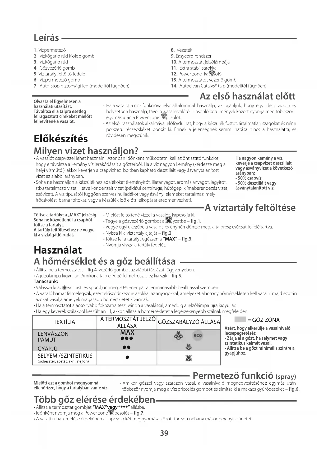 Leírás 1. Vízpermetező2. Vízkőgátló rúd kioldó gomb3. Vízkőgátló rúd4. Gőzvezérlő gomb5. Víztartály feltöltő fedele6. Vízpermetező gomb7. Auto-stop biztonsági led (modelltől függően)8. Vezeték9. Easycord rendszer10. A termosztát jelzőlámpája11. Extra stabil sarokkal12. Power zone kapcsoló13. A termosztátot vezérlő gomb14. Autoclean Catalys® talp (modelltől függően)Olvassa el figyelmesen ahasználati utasítást.Távolítsa el a talpra esetlegfelragasztott címkéket mielőttfelhevítené a vasalót.Töltse a tartályt a „MAX” jelzésig.Soha ne közvetlenül a csapbóltöltse a tartályt.A tartály feltöltéséhez ne vegyeki a vízkőgátló rudat.Ha nagyon kemény a víz,keverje a csapvizet desztilláltvagy ásványvizet a következőarányban:- 50% csapvíz,- 50% desztillált vagyásványtalanított víz.Azért, hogy elkerülje a vasalnivalólecsepegtetését:- Zárja el a gőzt, ha selymet vagyszintetikus kelmét vasal.- Allítsa be a gőzt minimális szintre agyapjúhoz.TEXTÍLIAA TERMOSZTÁT JELZŐÁLLÁSAGŐZSZABÁLYZÓ ÁLLÁSALENVÁSZONPAMUTGYAPJÚSELYEM /SZINTETIKUS (poliészter, acetát, akril, nejlon) MAX