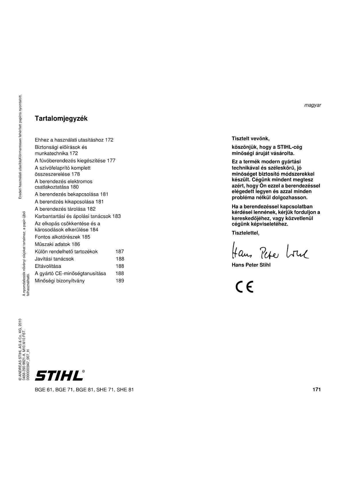 Tartalomjegyzék Tisztelt vevőnk, köszönjük, hogy a STIHL-cég minőségi áruját vásárolta. Ez a termék modern gyártási technikával és széleskörű, jó minőséget biztosító módszerekkel készült. Cégünk mindent megtesz azért, hogy Ön ezzel a berendezéssel elégedett legyen és azzal minden probléma nélkül dolgozhasson. Ha a berendezéssel kapcsolatban kérdései lennének, kérjük forduljon a kereskedőjéhez, vagy közvetlenül cégünk képviseletéhez. Tisztelettel, Hans Peter Stihl Ehhez a használati utasításhoz 172 Biztonsági előírások és munkatechnika 172 A fúvóberendezés kiegészítése 177 A szívófelaprító komplett összeszerelése 178 A berendezés elektromos csatlakoztatása 180 A berendezés bekapcsolása 181 A berendzés kikapcsolása 181 A berendezés tárolása 182 Karbantartási és ápolási tanácsok 183 Az elkopás csökkentése és a károsodások elkerülése 184 Fontos alkotórészek 185 Műszaki adatok 186 Külön rendelhető tartozékok 187 Javítási tanácsok 188 Eltávolítása 188 A gyártó CE-minőségtanusítása 188 Minőségi bizonyítvány 189BGE 61, BGE 71, BGE 81, SHE 71, SHE 81 magyar