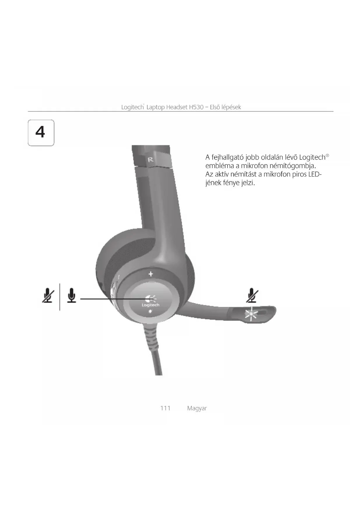 A fejhallgató jobb oldalán lévő Logitech® embléma a mikrofon némítógombja. Az aktív némítást a mikrofon piros LED- jének fénye jelzi.112 Magyar Logitech