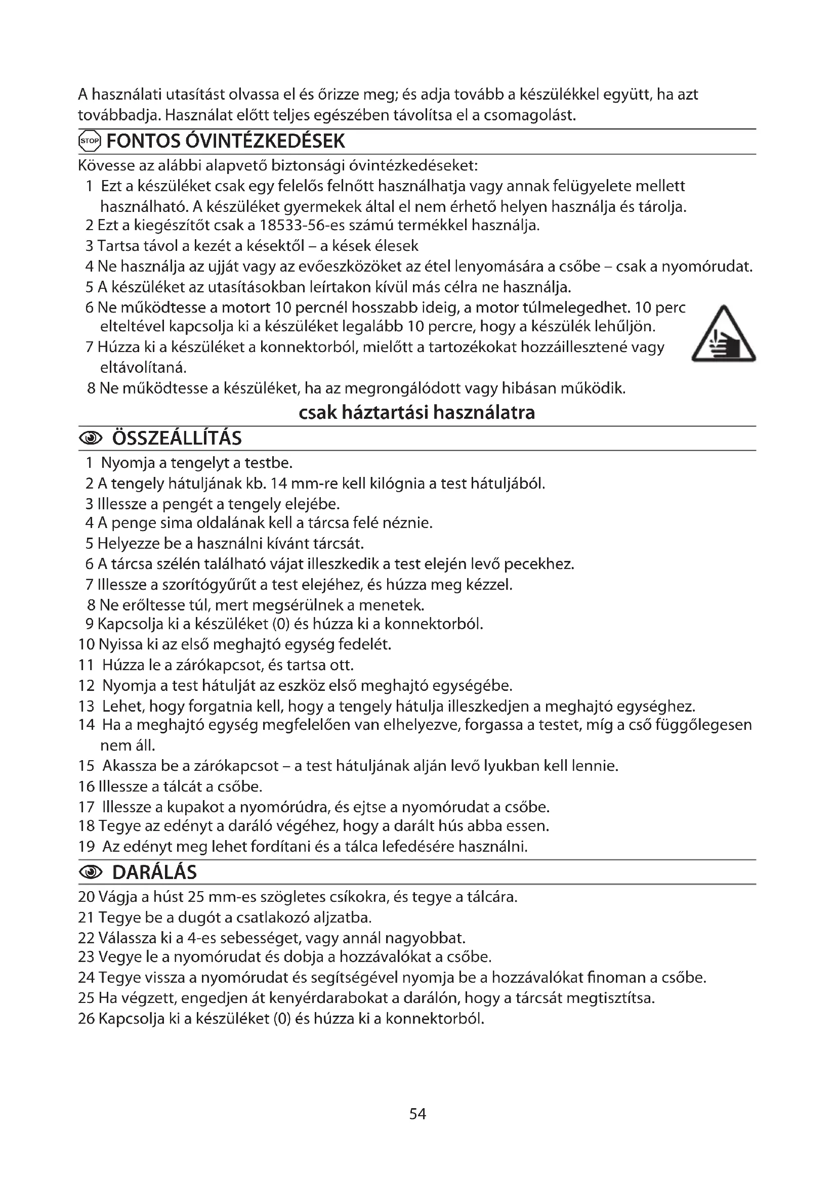 Kövesse az alábbi alapvető biztonsági óvintézkedéseket: 1 Ezt a készüléket csak egy felelős felnőtt használhatja vagy annak felügyelete mellett használható. A készüléket gyermekek által el nem érhető helyen használja és tárolja. 2 Ezt a kiegészítőt csak a 18533-56-es számú termékkel használja. 3 Tartsa távol a kezét a késektől – a kések élesek 4 Ne használja az ujját vagy az evőeszközöket az étel lenyomására a csőbe – csak a nyomórudat. 5 A készüléket az utasításokban leírtakon kívül más célra ne használja. 6 Ne működtesse a motort 10 percnél hosszabb ideig, a motor túlmelegedhet. 10 perc elteltével kapcsolja ki a készüléket legalább 10 percre, hogy a készülék lehűljön. 7 Húzza ki a készüléket a konnektorból, mielőtt a tartozékokat hozzáillesztené vagy eltávolítaná. 8 Ne működtesse a készüléket, ha az megrongálódott vagy hibásan működik. csak háztartási használatra