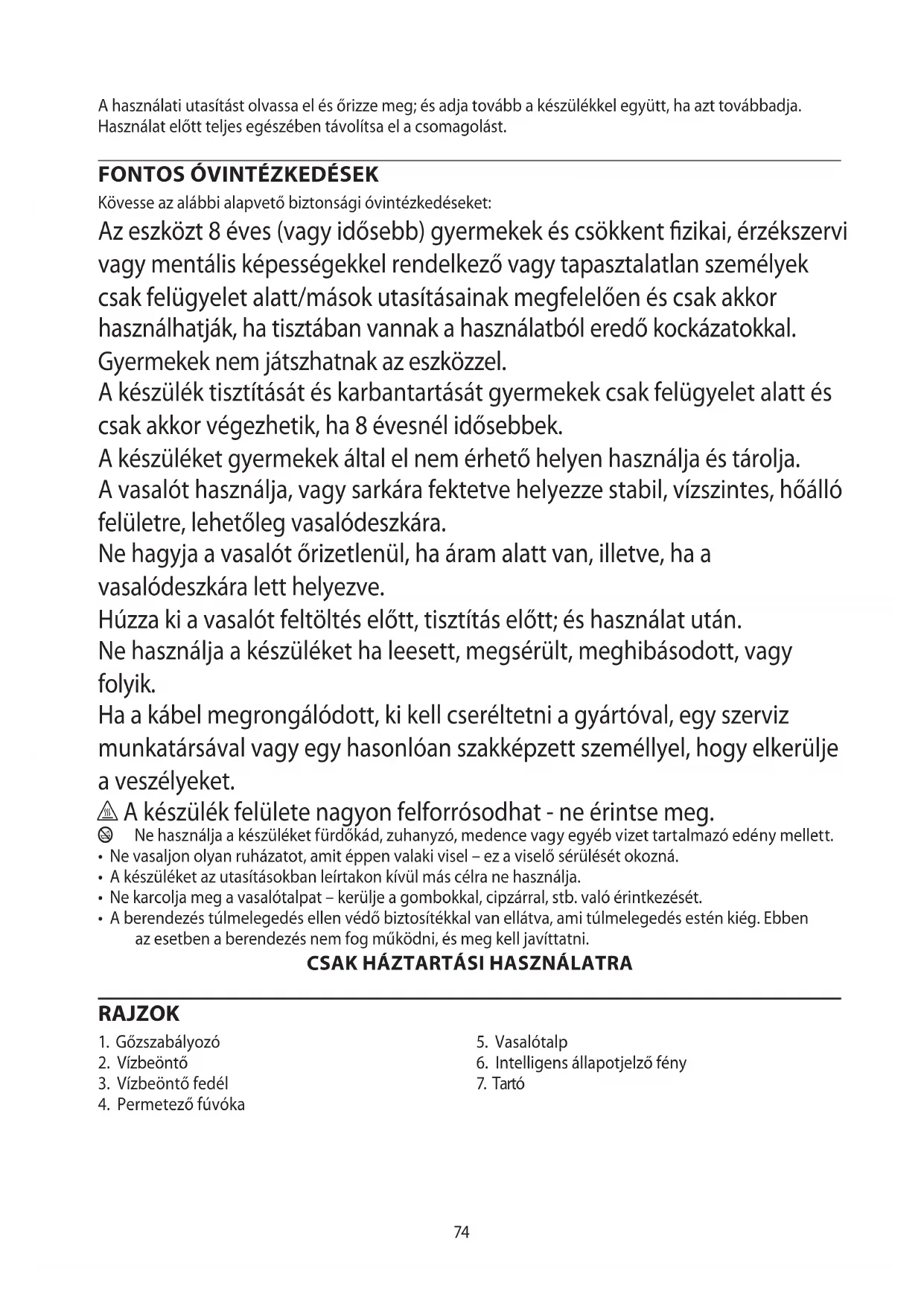 Kövesse az alábbi alapvető biztonsági óvintézkedéseket: Az eszközt 8 éves (vagy idősebb) gyermekek és csökkent zikai, érzékszervi vagy mentális képességekkel rendelkező vagy tapasztalatlan személyek csak felügyelet alatt/mások utasításainak megfelelően és csak akkor használhatják, ha tisztában vannak a használatból eredő kockázatokkal. Gyermekek nem játszhatnak az eszközzel. A készülék tisztítását és karbantartását gyermekek csak felügyelet alatt és csak akkor végezhetik, ha 8 évesnél idősebbek. A készüléket gyermekek által el nem érhető helyen használja és tárolja. A vasalót használja, vagy sarkára fektetve helyezze stabil, vízszintes, hőálló felületre, lehetőleg vasalódeszkára. Ne hagyja a vasalót őrizetlenül, ha áram alatt van, illetve, ha a vasalódeszkára lett helyezve. Húzza ki a vasalót feltöltés előtt, tisztítás előtt; és használat után. Ne használja a készüléket ha leesett, megsérült, meghibásodott, vagy folyik. Ha a kábel megrongálódott, ki kell cseréltetni a gyártóval, egy szerviz munkatársával vagy egy hasonlóan szakképzett személlyel, hogy elkerülje a veszélyeket. h A készülék felülete nagyon felforrósodhat - ne érintse meg. b Ne használja a készüléket fürdőkád, zuhanyzó, medence vagy egyéb vizet tartalmazó edény mellett.