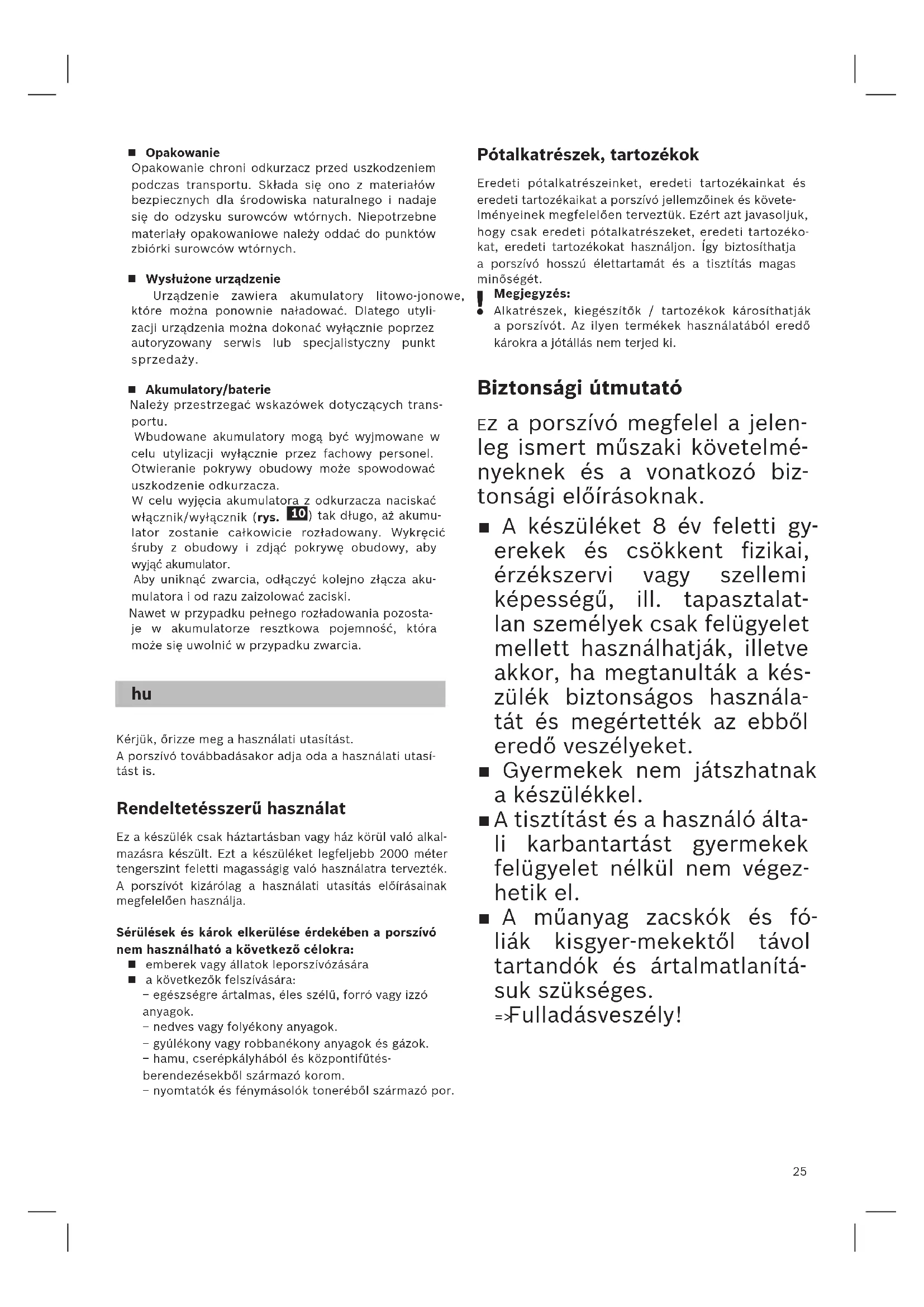 Ártalmatlanítási tudnivalók Lehetővé kell tenni a porszívó, az akkumulátorok, a tartozékok és a csomagolás környezetbarát újrahasz- nosítását. Ne dobja a porszívót és az akkukat/elemeket a háztartá- si szemétbe! Csomagolás A csomagolás védi a porszívót a szállítás során keletkező sérülésektől. A csomagolás környezet- barát anyagokból készült, és ezért újrafeldolgozásra alkalmas. A továbbiakban már nem szükséges cso- magolóanyagot helyezze el a szelektív gyűjtőhelyek megfelelő tárolóiban. Régi készülék A készülék újratölthető lítiumion-akkumulátorokat tartalmaz. Ezért a készüléket csak erre felhatalma- zott vevőszolgálaton vagy szakkereskedésen keresz- tül ártalmatlanítsa. Akkumulátorok / elemek Vegye figyelembe a szállítási tudnivalókat. A beépített akkumulátorokat ártalmatlanítás céljára csak szakképzett személyzet távolíthatja el. A burko- lat nyitásakor a porszívó megsérülhet. Ha ki akarja venni az akkut a porszívóból, tartsa nyomva a be-/kikapcsolót (