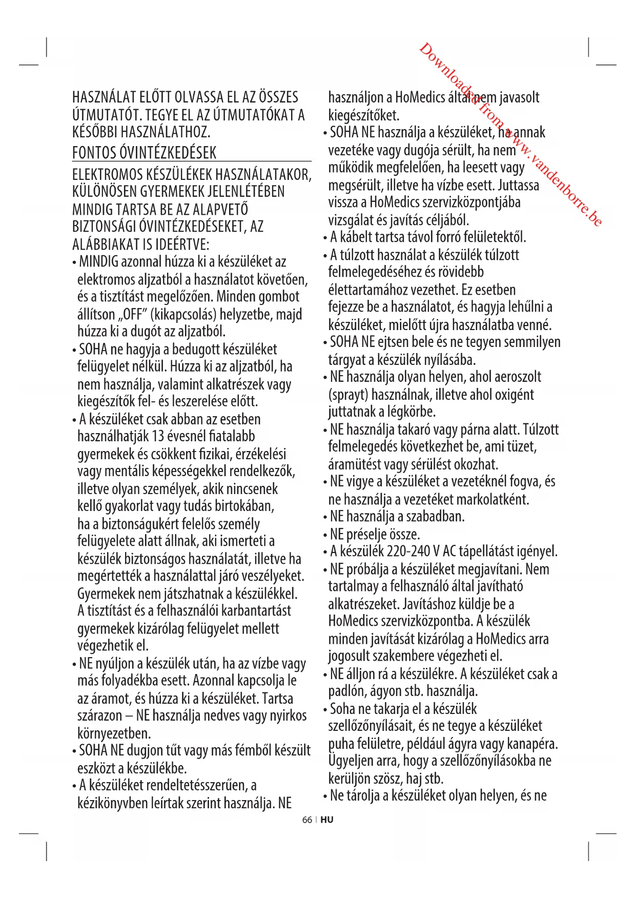 - A készüléket rendeltetésszerűen, a kézikönyvben leírtak szerint használja. NE használjon a HoMedics által nem javasolt kiegészítőket.