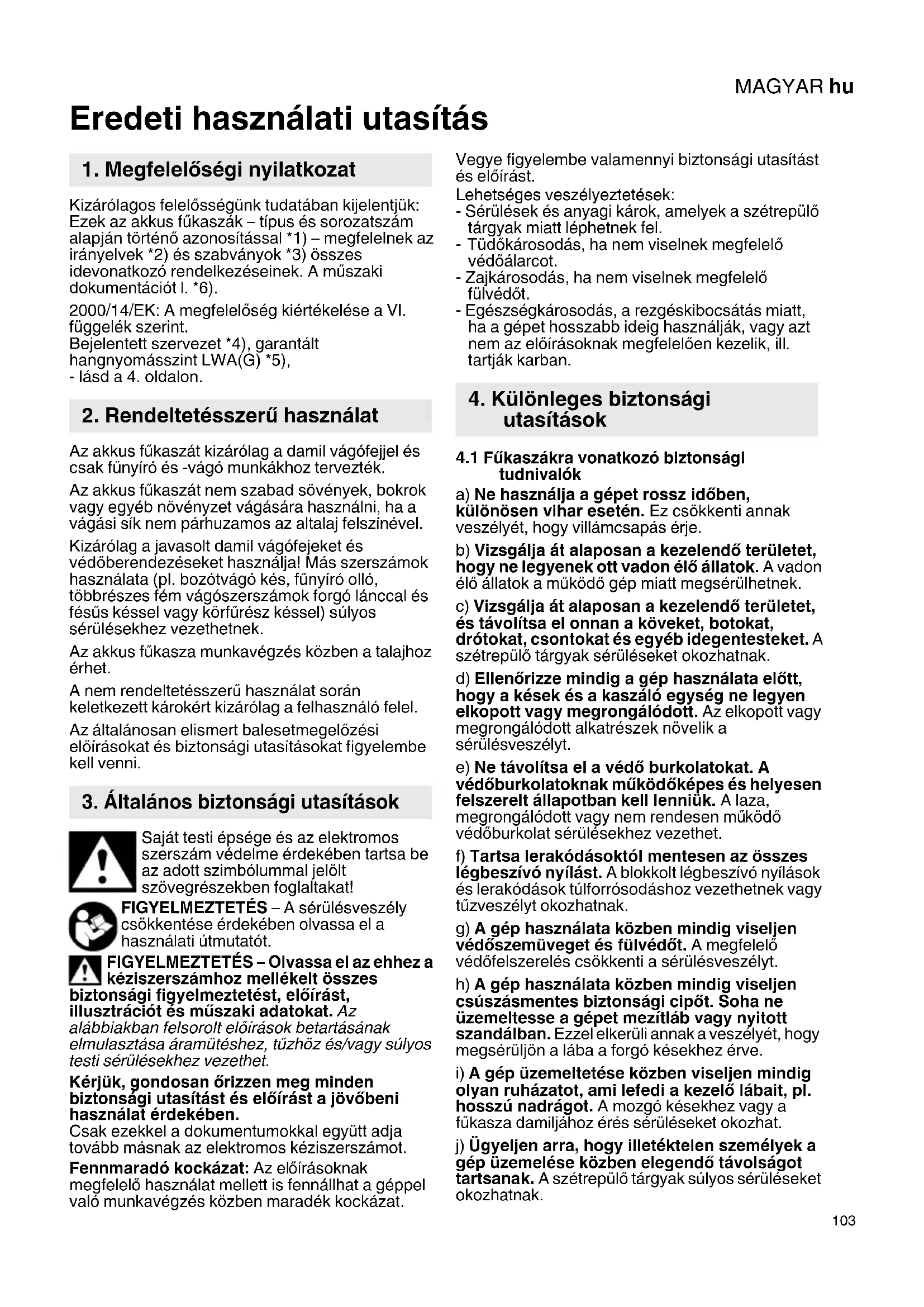 Eredeti használati utasítás Kizárólagos felelősségünk tudatában kijelentjük: Ezek az akkus fűkaszák – típus és sorozatszám alapján történő azonosítással *1) – megfelelnek az irányelvek *2) és szabványok *3) összes idevonatkozó rendelkezéseinek. A műszaki dokumentációt l. *6). 2000/14/EK: A megfelelőség kiértékelése a VI. függelék szerint. Bejelentett szervezet *4), garantált hangnyomásszint LWA(G) *5), - lásd a 4. oldalon. Az akkus fűkaszát kizárólag a damil vágófejjel és csak fűnyíró és -vágó munkákhoz tervezték. Az akkus fűkaszát nem szabad sövények, bokrok vagy egyéb növényzet vágására használni, ha a vágási sík nem párhuzamos az altalaj felszínével. Kizárólag a javasolt damil vágófejeket és védőberendezéseket használja! Más szerszámok használata (pl. bozótvágó kés, fűnyíró olló, többrészes fém vágószerszámok forgó lánccal és fésűs késsel vagy körfűrész késsel) súlyos sérülésekhez vezethetnek. Az akkus fűkasza munkavégzés közben a talajhoz érhet. A nem rendeltetésszerű használat során keletkezett károkért kizárólag a felhasználó felel. Az általánosan elismert balesetmegelőzési előírásokat és biztonsági utasításokat figyelembe kell venni. Saját testi épsége és az elektromos szerszám védelme érdekében tartsa be az adott szimbólummal jelölt szövegrészekben foglaltakat! FIGYELMEZTETÉS – A sérülésveszély csökkentése érdekében olvassa el a használati útmutatót. FIGYELMEZTETÉS – Olvassa el az ehhez a kéziszerszámhoz mellékelt összes biztonsági figyelmeztetést, előírást, illusztrációt és műszaki adatokat. Az alábbiakban felsorolt előírások betartásának elmulasztása áramütéshez, tűzhöz és/vagy súlyos testi sérülésekhez vezethet. Kérjük, gondosan őrizzen meg minden biztonsági utasítást és előírást a jövőbeni használat érdekében. Csak ezekkel a dokumentumokkal együtt adja tovább másnak az elektromos kéziszerszámot. Fennmaradó kockázat: Az el őírásoknak megfelelő használat mellett is fennállhat a géppel való munkavégzés közben maradék kockázat. Vegye figyelembe valamennyi biztonsági utasítást és előírást. Lehetséges veszélyeztetések: - Sérülések és anyagi károk, amelyek a szétrepülő tárgyak miatt léphetnek fel. -Tüdőkárosodás, ha nem viselnek megfelelő védőálarcot. - Zajkárosodás, ha nem viselnek megfelelő fülvédőt. - Egészségkárosodás, a rezgéskibocsátás miatt, ha a gépet hosszabb ideig használják, vagy azt nem az előírásoknak megfelelően kezelik, ill. tartják karban.
