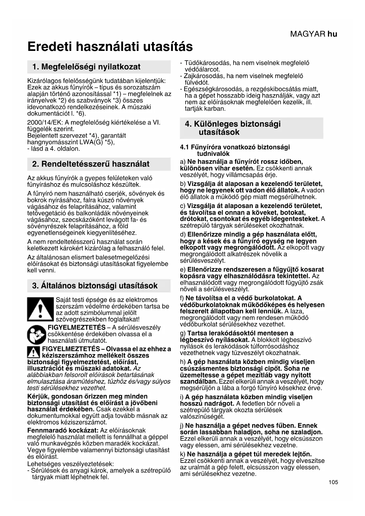 Eredeti használati utasítás Kizárólagos felelősségünk tudatában kijelentjük: Ezek az akkus fűnyírók – típus és sorozatszám alapján történő azonosítással *1) – megfelelnek az irányelvek *2) és szabványok *3) összes idevonatkozó rendelkezéseinek. A műszaki dokumentációt l. *6). 2000/14/EK: A megfelelőség kiértékelése a VI. függelék szerint. Bejelentett szervezet *4), garantált hangnyomásszint LWA(G) *5), - lásd a 4. oldalon. Az akkus fűnyírók a gyepes felületeken való fűnyíráshoz és mulcsoláshoz készültek. A fűnyíró nem használható cserjék, sövények és bokrok nyírásához, falra kúszó növények vágásához és felaprításához, valamint tetővegetáció és balkonládák növényeinek vágásához, szecskázóként levágott fa- és sövényrészek felaprításához, a föld egyenetlenségeinek kiegyenlítéséhez. A nem rendeltetésszerű használat során keletkezett károkért kizárólag a felhasználó felel. Az általánosan elismert balesetmegelőzési előírásokat és biztonsági utasításokat figyelembe kell venni. Saját testi épsége és az elektromos szerszám védelme érdekében tartsa be az adott szimbólummal jelölt szövegrészekben foglaltakat! FIGYELMEZTETÉS – A sérülésveszély csökkentése érdekében olvassa el a használati útmutatót. FIGYELMEZTETÉS – Olvassa el az ehhez a kéziszerszámhoz mellékelt összes biztonsági figyelmeztetést, előírást, illusztrációt és műszaki adatokat. Az alábbiakban felsorolt előírások betartásának elmulasztása áramütéshez, tűzhöz és/vagy súlyos testi sérülésekhez vezethet. Kérjük, gondosan őrizzen meg minden biztonsági utasítást és előírást a jövőbeni használat érdekében. Csak ezekkel a dokumentumokkal együtt adja tovább másnak az elektromos kéziszerszámot. Fennmaradó kockázat: Az előírásoknak megfelelő használat mellett is fennállhat a géppel való munkavégzés közben maradék kockázat. Vegye figyelembe valamennyi biztonsági utasítást és előírást. Lehetséges veszélyeztetések: - Sérülések és anyagi károk, amelyek a szétrepülő tárgyak miatt léphetnek fel. -Tüdőkárosodás, ha nem viselnek megfelelő védőálarcot. - Zajkárosodás, ha nem viselnek megfelelő fülvédőt. - Egészségkárosodás, a rezgéskibocsátás miatt, ha a gépet hosszabb ideig használják, vagy azt nem az előírásoknak megfelelően kezelik, ill. tartják karban.