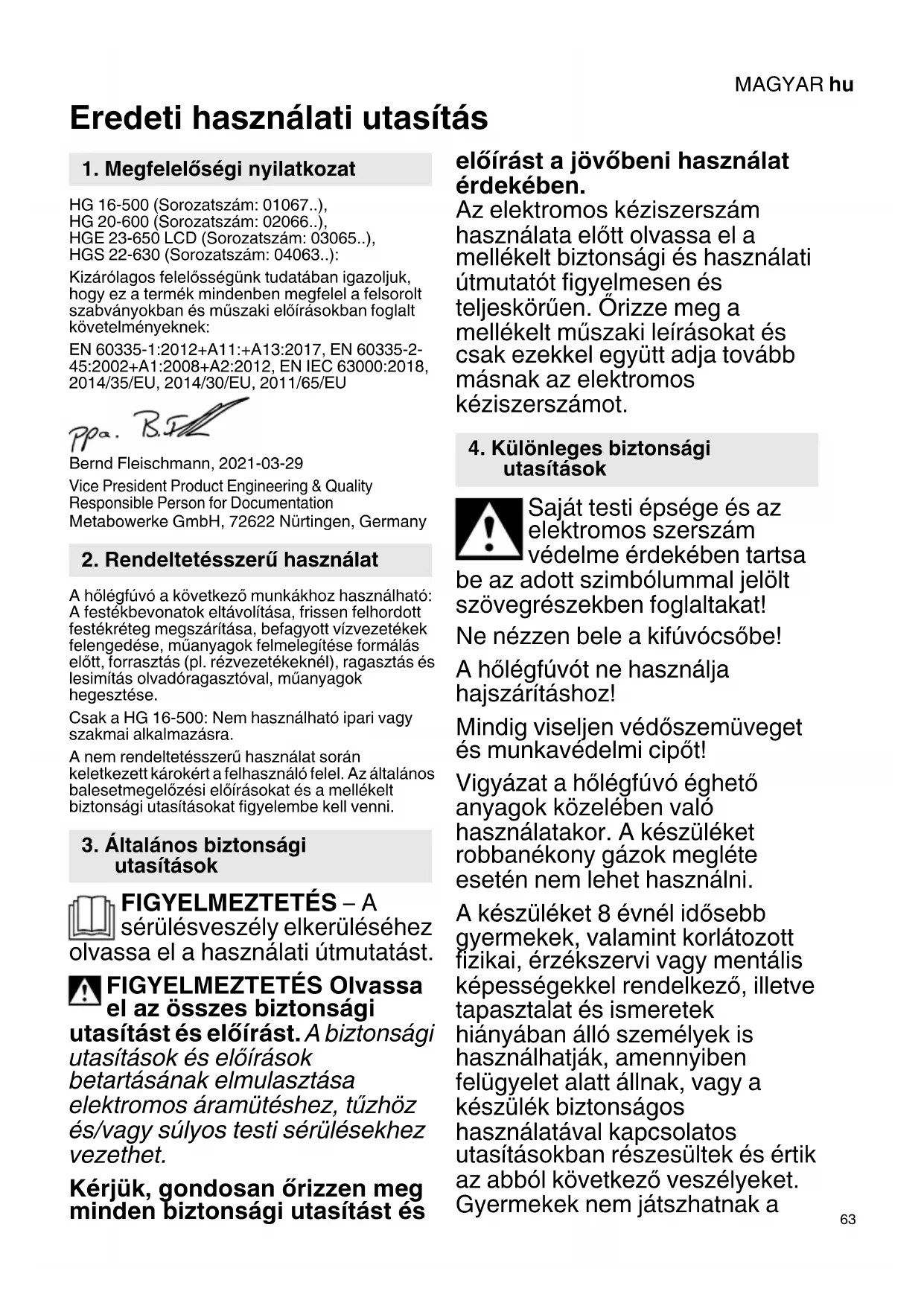 Eredeti használati utasítás HG 16-500 (Sorozatszám: 01067..), HG 20-600 (Sorozatszám: 02066..), HGE 23-650 LCD (Sorozatszám: 03065..), HGS 22-630 (Sorozatszám: 04063..): Kizárólagos felelősségünk tudatában igazoljuk, hogy ez a termék mindenben megfelel a felsorolt szabványokban és műszaki előírásokban foglalt követelményeknek: EN 60335-1:2012+A11:+A13:2017, EN 60335-2- 45:2002+A1:2008+A2:2012, EN IEC 63000:2018, 2014/35/EU, 2014/30/EU, 2011/65/EU Bernd Fleischmann, 2021-03-29 Vice President Product Engineering & Quality Responsible Person for Documentation Metabowerke GmbH, 72622 Nürtingen, Germany A hőlégfúvó a következő munkákhoz használható: A festékbevonatok eltávolítása, frissen felhordott festékréteg megszárítása, befagyott vízvezetékek felengedése, műanyagok felmelegítése formálás előtt, forrasztás (pl. rézvezetékeknél), ragasztás és lesimítás olvadóragasztóval, műanyagok hegesztése. Csak a HG 16-500: Nem használható ipari vagy szakmai alkalmazásra. A nem rendeltetésszerű használat során keletkezett károkért a felhasználó felel. Az általános balesetmegelőzési előírásokat és a mellékelt biztonsági utasításokat figyelembe kell venni.