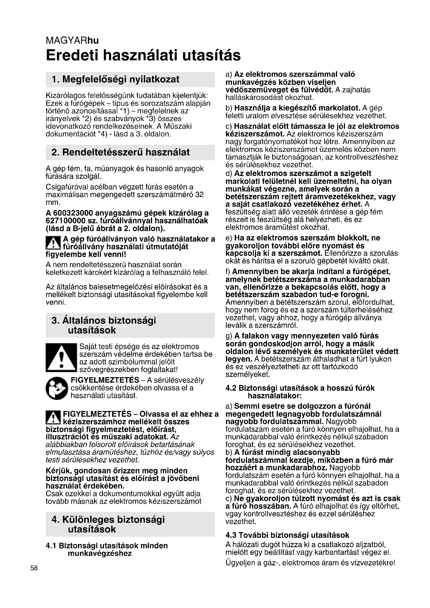 Eredeti használati utasítás Kizárólagos felelősségünk tudatában kijelentjük: Ezek a fúrógépek – típus és sorozatszám alapján történő azonosítással *1) – megfelelnek az irányelvek *2) és szabványok *3) összes idevonatkozó rendelkezéseinek. A Műszaki dokumentációt *4) - lásd a 3. oldalon. A gép fém, fa, műanyagok és hasonló anyagok fúrására szolgál. Csigafúróval acélban végzett fúrás esetén a maximálisan megengedett szerszámátmérő 32 mm. A 600323000 anyagszámú gépek kizárólag a 627100000 sz. fúróállvánnyal használhatóak (lásd a B-jelű ábrát a 2. oldalon). A gép fúróállványon való használatakor a fúróállvány használati útmutatóját figyelembe kell venni! A nem rendeltetésszerű használat során keletkezett károkért kizárólag a felhasználó felel. Az általános balesetmegelőzési előírásokat és a mellékelt biztonsági utasításokat figyelembe kell venni. Saját testi épsége és az elektromos szerszám védelme érdekében tartsa be az adott szimbólummal jelölt szövegrészekben foglaltakat! FIGYELMEZTETÉS – A sérülésveszély csökkentése érdekében olvassa el a használati utasítást. FIGYELMEZTETÉS – Olvassa el az ehhez a kéziszerszámhoz mellékelt összes biztonsági figyelmeztetést, előírást, illusztrációt és műszaki adatokat. Az alábbiakban felsorolt előírások betartásának elmulasztása áramütéshez, tűzhöz és/vagy súlyos testi sérülésekhez vezethet. Kérjük, gondosan őrizzen meg minden biztonsági utasítást és előírást a jövőbeni használat érdekében. Csak ezekkel a dokumentumokkal együtt adja tovább másnak az elektromos kéziszerszámot