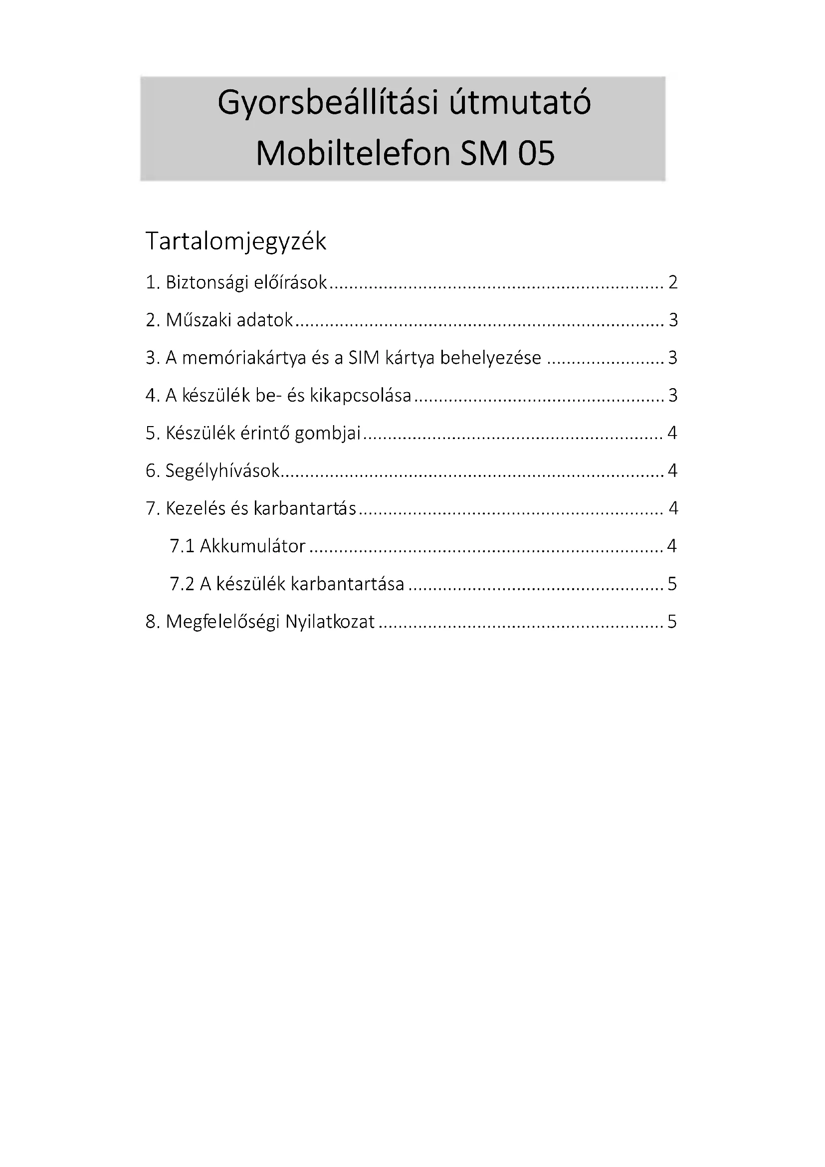 Designed and Engineered by Blaupunkt Competence Center Mobile Europe HTM Mobile Kft. 1118 Budapest, Dayka Gábor utca 3. Hungary Assembled in P.R.C by Mobiwire Mobiles (NingBo) Co., Ltd Building A.No.999 Dacheng Road, Fenghua, Ningbo, Zhejiang, China 315500 A készülékkel kapcsolatos bővebb információért, keresse fel honlapunkat: www.htmmobile.hu vagy www.blaupunkt.com A Google és más jelölések a Google LLC védjegyei.Stručný návod na obsluhu Mobilný telefón SM 05 Obsah