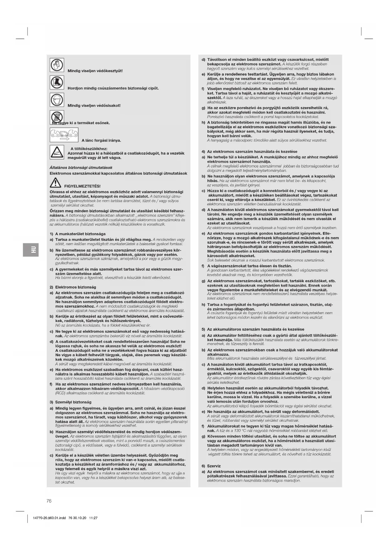 A lánc forgási iránya. A töltőkészülékhez: Azonnal húzza ki a hálózatból a csatlakozódugót, ha a vezeték megsérült vagy át lett vágva. Általános biztonsági útmutatások Elektromos szerszámokkal kapcsolatos általános biztonsági útmutatások FIGYELMEZTETÉS! Olvassa el ehhez az elektromos eszközhöz adott valamennyi biztonsági útmutatást, utasítást, képanyagot és műszaki adatot. A biztonsági útmu- tatások és figyelmeztetések be nem tartása áramütést, tüzet és / vagy súlyos személyi sérülést okozhat. Őrizzen meg minden biztonsági útmutatást és utasítást későbbi felhasz- nálásra. A biztonsági útmutatásokban alkalmazott ,,elektromos szerszám” kifeje- zés a hálózatra (csatlakozókábellel) csatlakoztatható elektromos szerszámokra és az akkumulátoros (hálózati vezeték nélküli) készülékekre is vonatkozik.