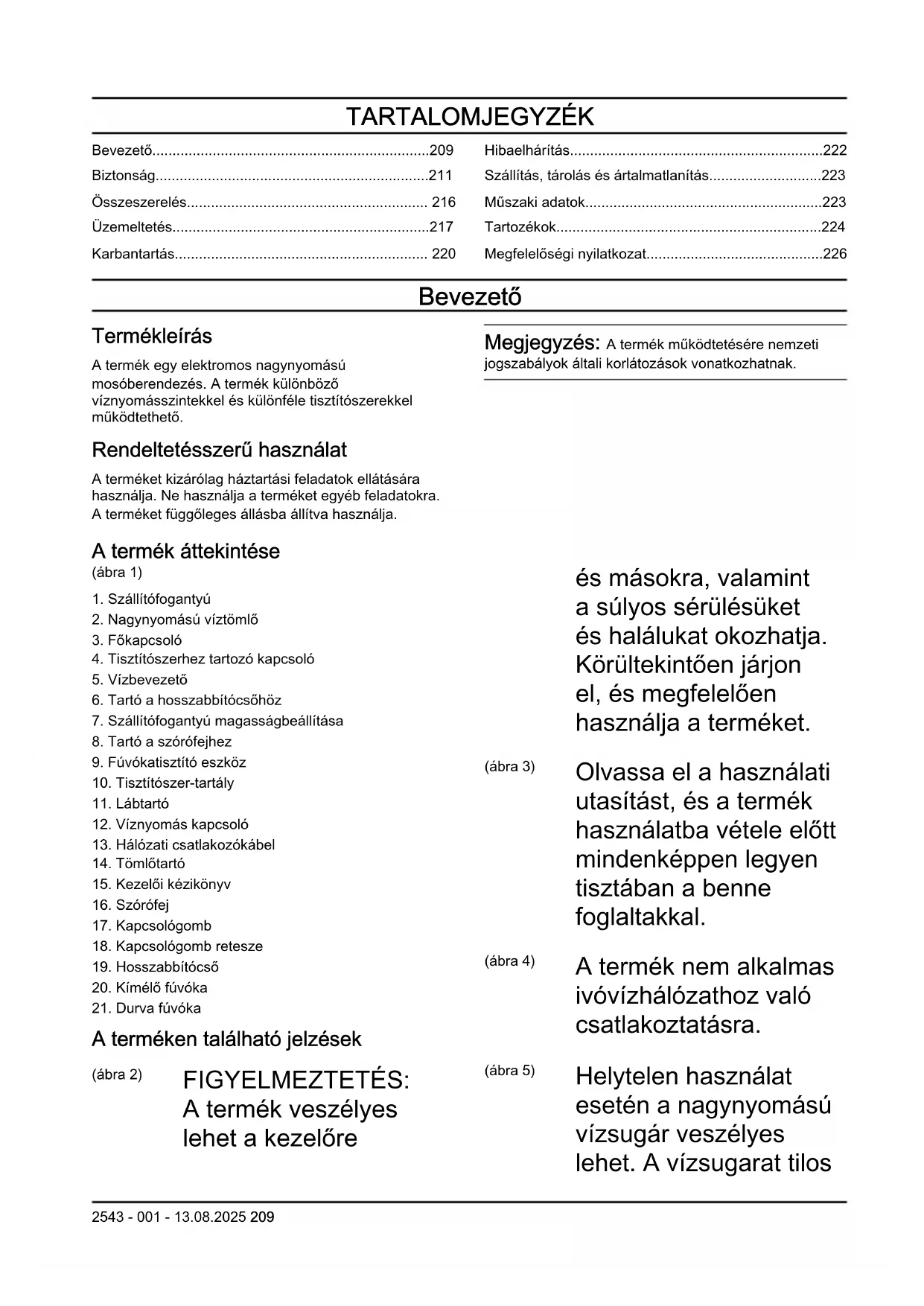 A terméken található jelzések (ábra 2) FIGYELMEZTETÉS: A termék veszélyes lehet a kezelőre és másokra, valamint a súlyos sérülésüket és halálukat okozhatja. Körültekintően járjon el, és megfelelően használja a terméket. (ábra 3) Olvassa el a használati utasítást, és a termék használatba vétele előtt mindenképpen legyen tisztában a benne foglaltakkal. (ábra 4) A termék nem alkalmas ivóvízhálózathoz való csatlakoztatásra. (ábra 5) Helytelen használat esetén a nagynyomású vízsugár veszélyes lehet. A vízsugarat tilos 2543 - 001 - 13.08.2025 209személyek, elektromos berendezések vagy a termék felé irányítani. (ábra 6) Környezetvédelmi jelzés. A termék és a termék csomagolása nem minősül háztartási hulladéknak. Újrahasznosítását egy jóváhagyott, az elektromos és elektronikus berendezések újrahasznosítására szolgáló ponton kell elvégezni. (ábra 7)