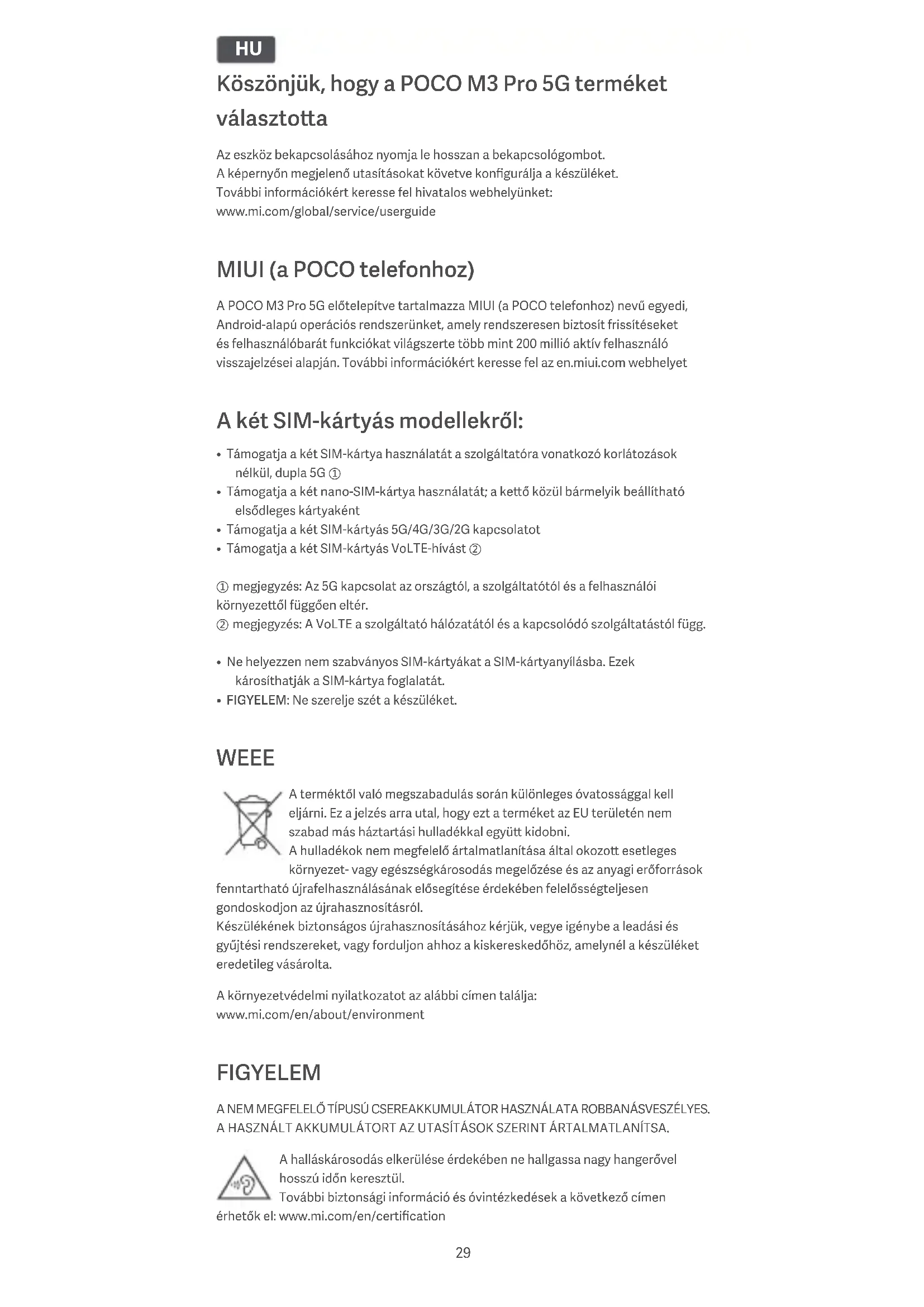 - FIGYELEM: Ne szerelje szét a készüléket. WEEE A terméktől való megszabadulás során különleges óvatossággal kell eljárni. Ez a jelzés arra utal, hogy ezt a terméket az EU területén nem szabad más háztartási hulladékkal együ kidobni. A hulladékok nem megfelelő ártalmatlanítása által okozo esetleges környezet- vagy egészségkárosodás megelőzése és az anyagi erőforrások fenntartható újrafelhasználásának elősegítése érdekében felelősségteljesen gondoskodjon az újrahasznosításról. Készülékének biztonságos újrahasznosításához kérjük, vegye igénybe a leadási és gyűjtési rendszereket, vagy forduljon ahhoz a kiskereskedőhöz, amelynél a készüléket eredetileg vásárolta. A környezetvédelmi nyilatkozatot az alábbi címen találja: www.mi.com/en/about/environment FIGYELEM A NEM MEGFELELŐ TÍPUSÚ CSEREAKKUMULÁTOR HASZNÁLATA ROBBANÁSVESZÉLYES. A HASZNÁLT AKKUMULÁTORT AZ UTASÍTÁSOK SZERINT ÁRTALMATLANÍTSA. A halláskárosodás elkerülése érdekében ne hallgassa nagy hangerővel hosszú időn keresztül. További biztonsági információ és óvintézkedések a következő címen érhetők el: www.mi.com/en/certification