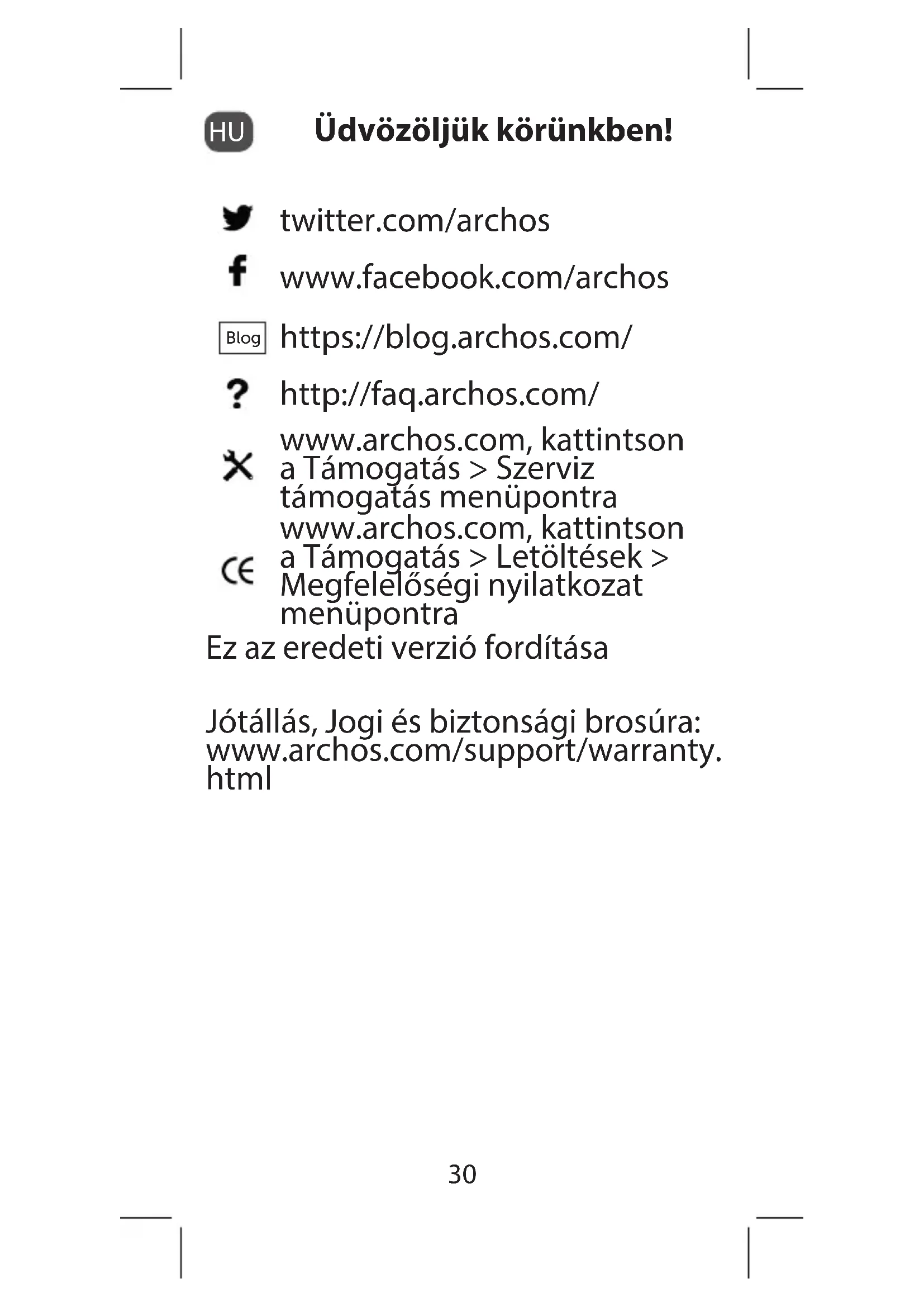Üdvözöljük körünkben! twitter.com/archos www.facebook.com/archos Blog https://blog.archos.com/ http://faq.archos.com/ www.archos.com, kattintson a Támogatás > Szerviz támogatás menüpontra www.archos.com, kattintson a Támogatás > Letöltések > Megfelelőségi nyilatkozat menüpontra Ez az eredeti verzió fordítása Jótállás, Jogi és biztonsági brosúra: www.archos.com/support/warranty. html31