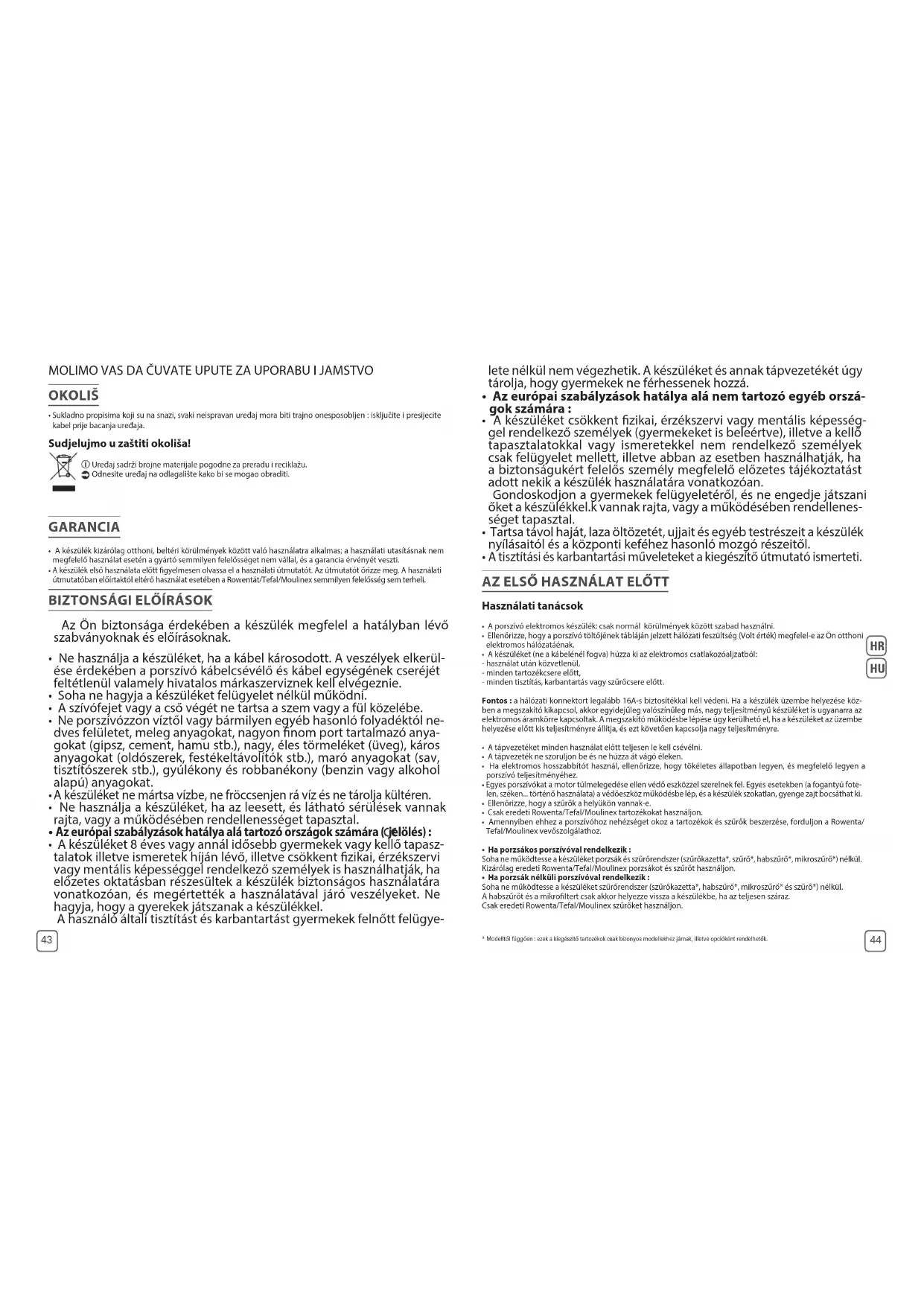 - A készülék kizárólag otthoni, beltéri körülmények között való használatra alkalmas; a használati utasításnak nem megfelelő használat esetén a gyártó semmilyen felelősséget nem vállal, és a garancia érvényét veszti. A készülék első használata előtt gyelmesen olvassa el a használati útmutatót. Az útmutatót őrizze meg. A használati útmutatóban előírtaktól eltérő használat esetében a Rowentát/Tefal/Moulinex semmilyen felelősség sem terheli.