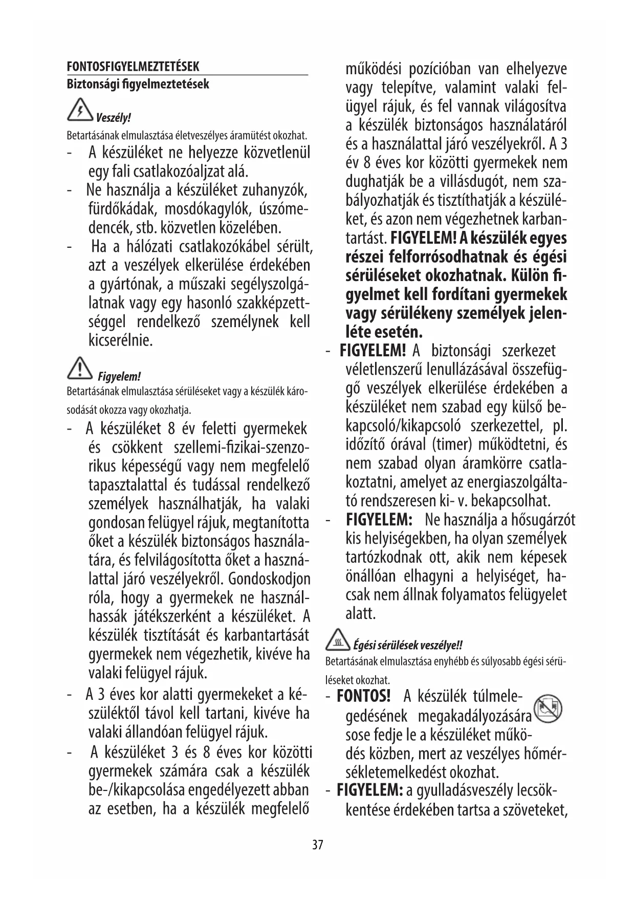 - Ha lenyeli, súlyos sérülést okozhat 2 óránál rövidebb idő alatt vagy halált a vegyi égési sérülések és a nyelőcső potenciális perforációja miatt. - Vizsgálja meg az eszközöket és győződ- jön meg róla, hogy az elemtartó meg- felelően van bezárva. Ne használja, ha a rekesz nem biztonságos - A használt gombelemeket azonnal és biztonságosan ártalmatlanítsa. A le-39 merült elemek is veszélyesek lehetnek. Fontos tudnivalók a biztonsággal kapcsolatban Kedves Ügyfél - az üzemelés során ennek a készüléknek a villásdugója felmelegszik: ez teljesen rendben van. Ez egy NAGY TELJESÍTMÉNYŰ MELEGÍTŐ KÉSZÜLÉK, amely megfelel a megszokott fokozott minőséget biztosító szabványainknak. Kérjük, ellenőrizze, hogy a fali csatlakozó aljzatok jó állapotban vannak-e, és a villásdugó megfelelően be van-e dugva, nehogy véletlenül felmelegedjen. Amikor a készüléket hosszú időn át használják, javasoljuk, hogy ellenőrizze a HÁLÓZATI ALJZATOT és a villásdugót rendszeresen, és ha kétsége van, forduljon egy villanyszerelőhöz. Csak EU-n kívüli országok: Ne hagyja, hogy korlátozott pszichikai-- zikai-érzékszervi képességű személyek használják a készüléket (beleértve a gyer- mekeket is), vagy akik nem rendelkeznek elegendő ismerettel és tapasztalattal, hacsak a testi épségükért felelős személy nem tanítja be őket, és nem vigyáz rájuk körültekintően. Figyeljen oda a gyerekek- re, győződjön meg arról, hogy nem játsza- nak a készülékkel. A készülék ártalmatlanítása és hulla- dékkezelés Aleselejtezett készüléket nem sza- bad a lakossági hulladékkal együtt kezelni, hanem egy kijelölt szelektív hulladékgyűjtő szigeten kell elhelyezni.40