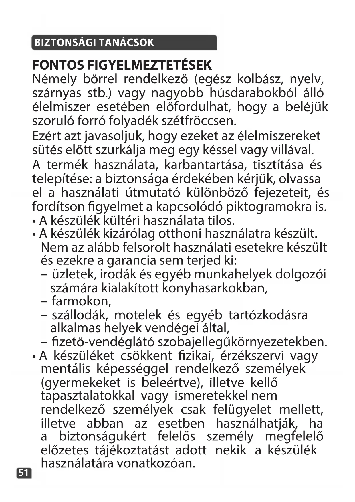 - A készüléket 8 éves vagy annál idősebb gyermekek is, továbbá kellő tapasztalattal és ismeretekkel nem rendelkező, vagy csökkent zikai, érzékszervi vagy mentális képességgel rendelkező személyek is használhatják, ha annak biztonságos használatára felkészítették, kiképezték őket és ismerik a használatával járó veszélyeket. A használó általi tisztítást és karbantartást gyermekek nem végezhetik, ez alól kivételt képeznek a legalább 8 éves vagy annál idősebb és felügyelet alatt álló gyermekek.