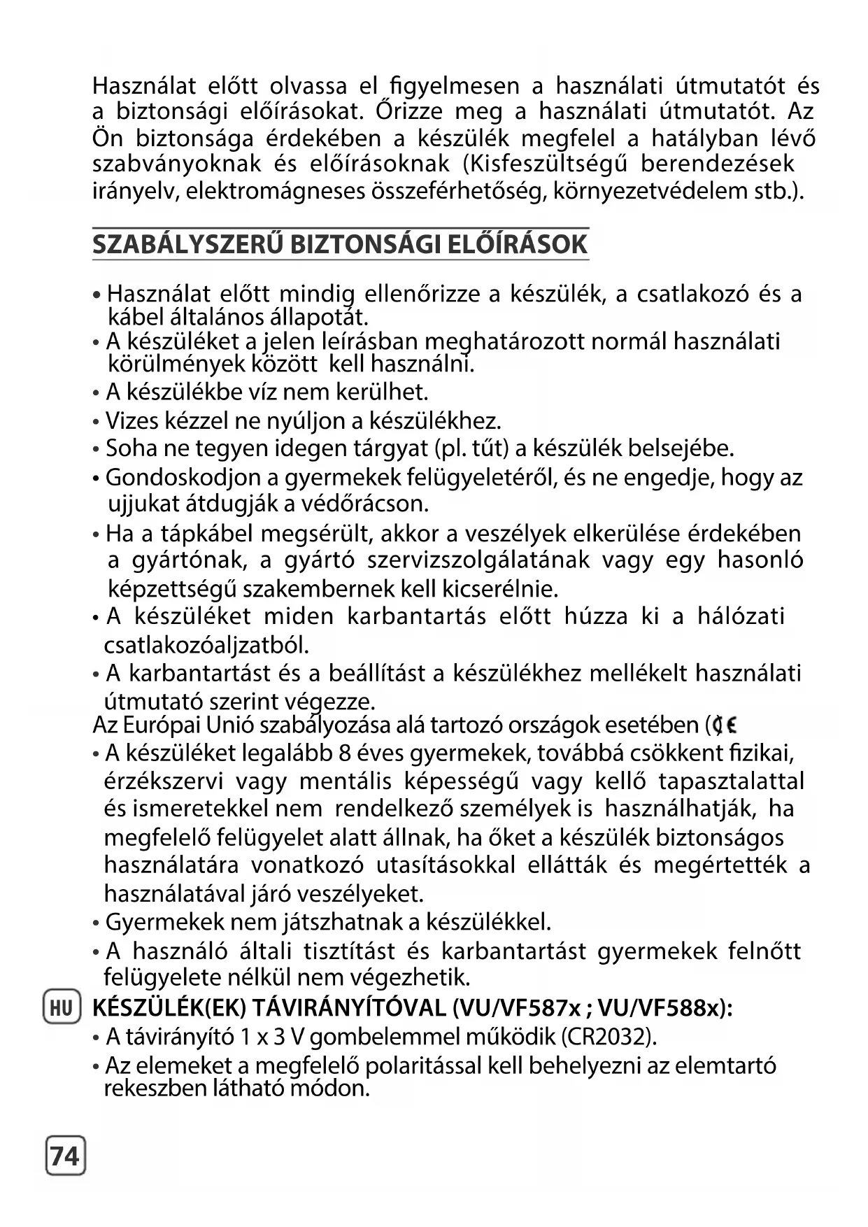 - A használó általi tisztítást és karbantartást gyermekek felnőtt felügyelete nélkül nem végezhetik. KÉSZÜLÉK(EK) TÁVIRÁNYÍTÓVAL (VU/VF587x ; VU/VF588x):