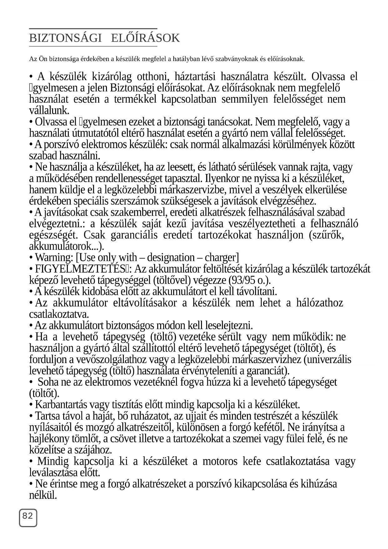 - A portartályt és a motorvédő szűrőt ne tisztítsa mosogatógépben. HU84 AZ AKKUMULÁTORRA VONATKOZÓ BIZTONSÁGI ELŐÍRÁSOK