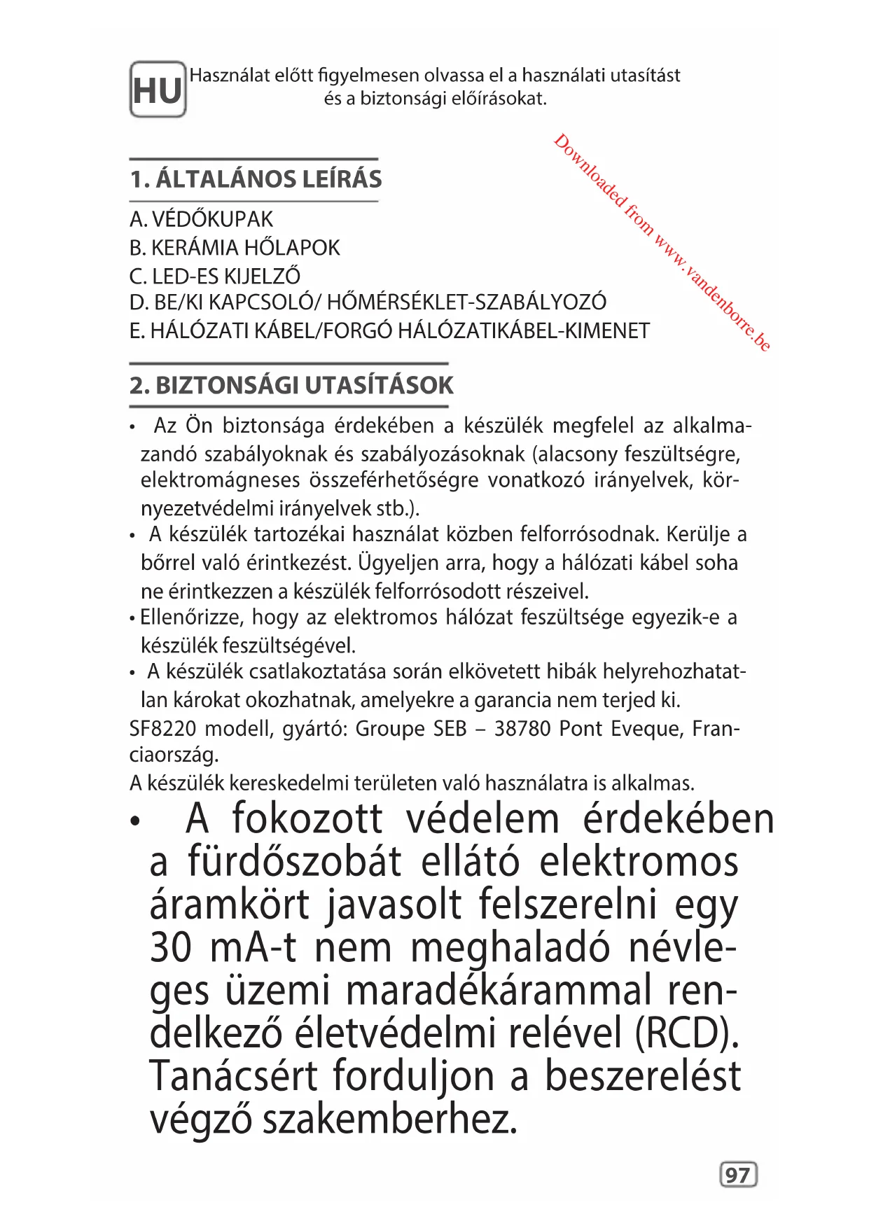 - A készülék csatlakoztatása során elkövetett hibák helyrehozhatat- lan károkat okozhatnak, amelyekre a garancia nem terjed ki. SF8220 modell, gyártó: Groupe SEB – 38780 Pont Eveque, Fran- ciaország. A készülék kereskedelmi területen való használatra is alkalmas.