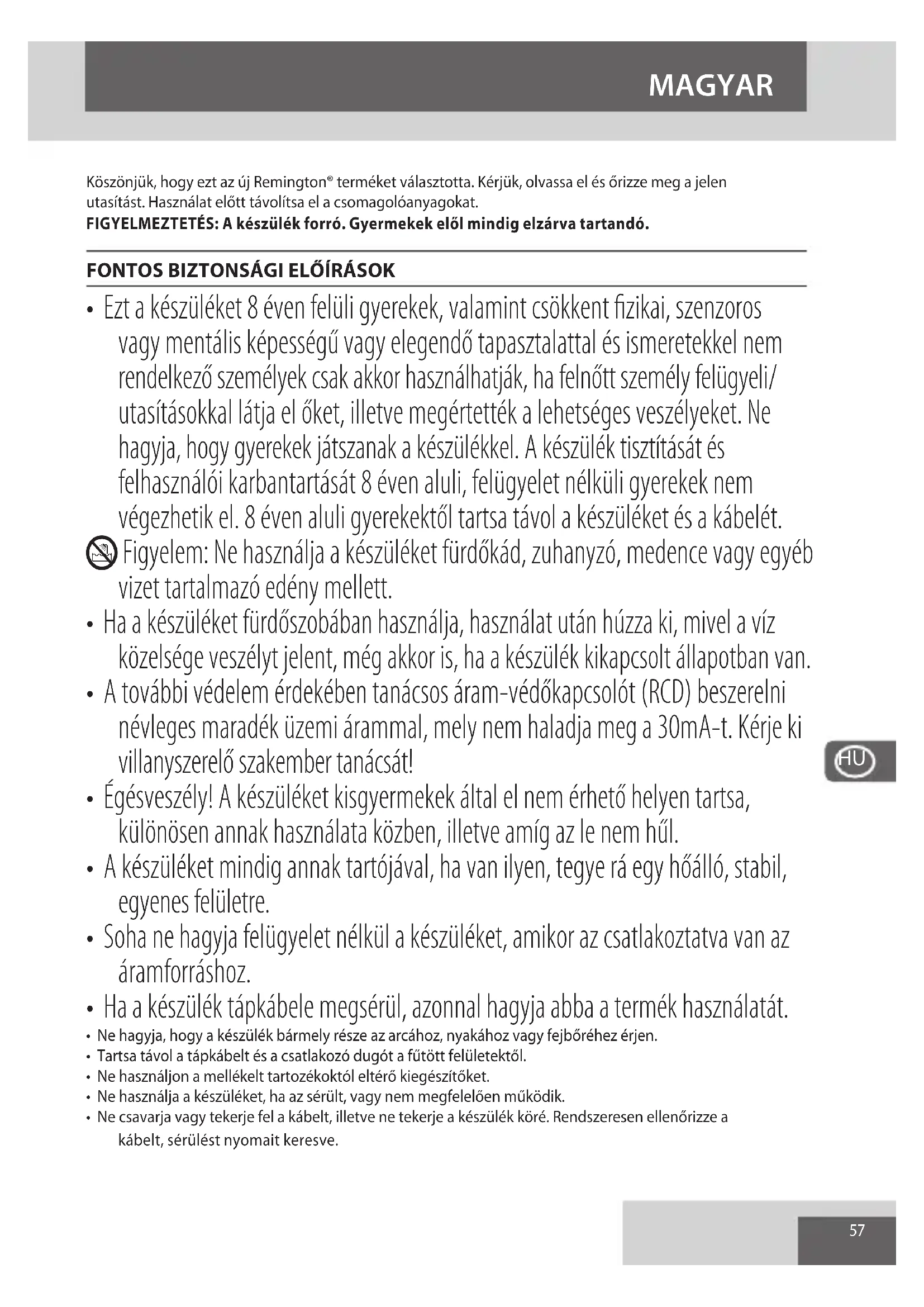 Az alábbi jelölések valamelyikével ellátott készülékekben, valamint újratölthető és nem újratölthető akkumulátorokban jelen lévő veszélyes anyagok jelentette környezeti és egészségi kockázatok elkerülése érdekében ezeket tilos a háztartási hulladékkal együtt megsemmisíteni. Az elektromos és elektronikus termékeket, és, ha vannak, az újratölthető és nem újratölthető akkumulátorokat mindig a megfelelő hivatalos hulladék-újrahasznosító/begyűjtő központba kell vinni. MAGYAR61 Выпрямитель электрический для волос Спасибо за покупку нового изделия Remington®. Перед использованием внимательно ознакомьтесь с инструкцией и сохраните ее. Перед применением изделия снимите с него упаковку. ПРЕДУПРЕЖДЕНИЕ: прибор горячий. Всегда храните в недоступном для детей месте. ВАЖНЫЕ МЕРЫ БЕЗОПАСНОСТИ