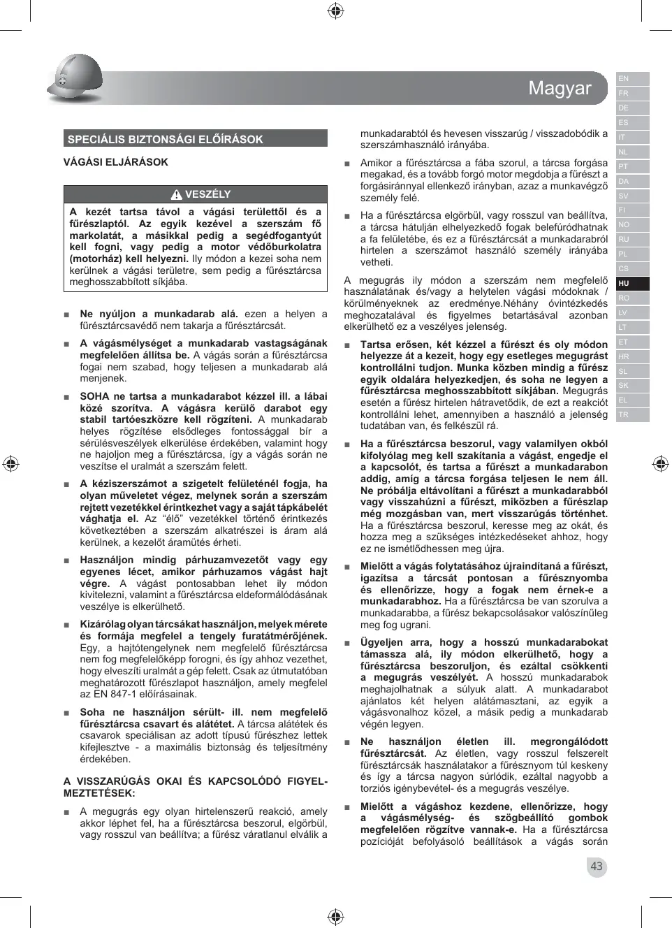 Minden használat előtt ellenőrizze, hogy az alsó fűrésztárcsavédő megfelelőképp takarja-e a tárcsát. Ne használja a fűrészt, ha az alsó fűrésztárcsavédőt nem lehet szabadon mozgatni ill. ha nem záródik azonnal a tárcsára. Soha ne rögzítse, ill. kösse ki nyitott állapotban az alsó fűrésztárcsavédőt. Ha véletlenül leesik a fűrész, az alsó fűrésztárcsavédő meghajolhat. A kar segítségével emelje fel a tárcsavédőt, és bizonyosodjon meg arról, hogy nehézség nélkül mozgatható, valamint hogy se a fűrésztárcsához, se bármilyen más alkatrészhez nem ér, bármilyen legyen is a vágás szöge és mélysége. Bizonyosodjon meg arról, hogy az alsó fűrésztárcsavédő rugója jó állapotban van és helyesen működik. Amennyiben a fűrésztárcsavédő vagy a rugó nem megfelelőképp működik, javíttassa meg, vagy cseréltesse ki az adott elemet, mielőtt a fűrészt használatba venné. Az alsó védőburkolat nehézkesen mozoghat sérült alkatrészek, gumilerakódások vagy a túl sok lerakódott szennyeződés miatt. Az alsó védőburkolat manuálisan is visszahúzható, de ez csak a speciális vágásokhoz, például „beszúró vágásokhoz" és „kombinált vágásokhoz" engedélyezett. A kar segítségével emelje fel az alsó fűrésztárcsavédőt.Ezután engedje el, amint a fűrésztárcsa belekap a munkadarabba. Bármilyen más típusú vágásnál az alsó fűrésztárcsavédő automatikusan kerül a helyére. Mielőtt a fűrészt egy munkaasztalra vagy a földre tenné, mindig ellenőrizze, hogy az alsó fűrésztárcsavédő jól takarja-e a tárcsát. Ha a fűrésztárcsa nincs megfelelőképp takarva, lendületből mozoghat, és elvághatja azt, ami az útjába kerül. Mindig legyen tudatában annak, hogy a fűrésztárcsa bizonyos ideig még forog a motor leállása után.