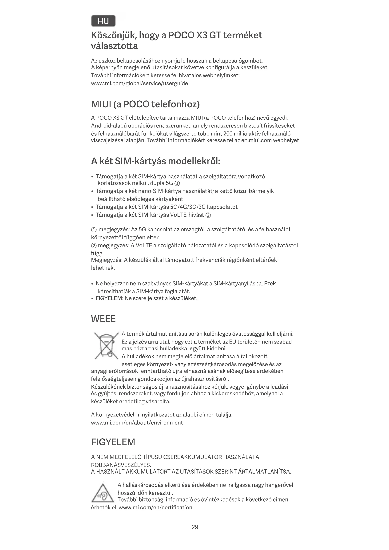 - FIGYELEM: Ne szerelje szét a készüléket. WEEE A termék ártalmatlanítása során különleges óvatossággal kell eljárni. Ez a jelzés arra utal, hogy ezt a terméket az EU területén nem szabad más háztartási hulladékkal együ kidobni. A hulladékok nem megfelelő ártalmatlanítása által okozo esetleges környezet- vagy egészségkárosodás megelőzése és az anyagi erőforrások fenntartható újrafelhasználásának elősegítése érdekében felelősségteljesen gondoskodjon az újrahasznosításról. Készülékének biztonságos újrahasznosításához kérjük, vegye igénybe a leadási és gyűjtési rendszereket, vagy forduljon ahhoz a kiskereskedőhöz, amelynél a készüléket eredetileg vásárolta. A környezetvédelmi nyilatkozatot az alábbi címen találja: www.mi.com/en/about/environment FIGYELEM A NEM MEGFELELŐ TÍPUSÚ CSEREAKKUMULÁTOR HASZNÁLATA ROBBANÁSVESZÉLYES. A HASZNÁLT AKKUMULÁTORT AZ UTASÍTÁSOK SZERINT ÁRTALMATLANÍTSA. A halláskárosodás elkerülése érdekében ne hallgassa nagy hangerővel hosszú időn keresztül. További biztonsági információ és óvintézkedések a következő címen érhetők el: www.mi.com/en/certification 29Fontos biztonsági információk A készülék használata elő olvassa el az alábbi biztonsági információkat: