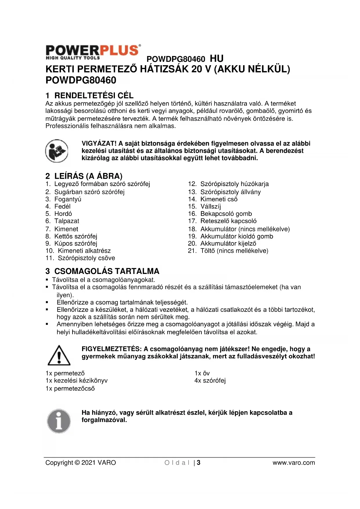 - Permetezés közben tartsa távol a nézelődőket, gyermekeket és a háziállatokat.POWDPG80460 HU Copyright © 2021 VARO O l d a l | 7 www.varo.com
