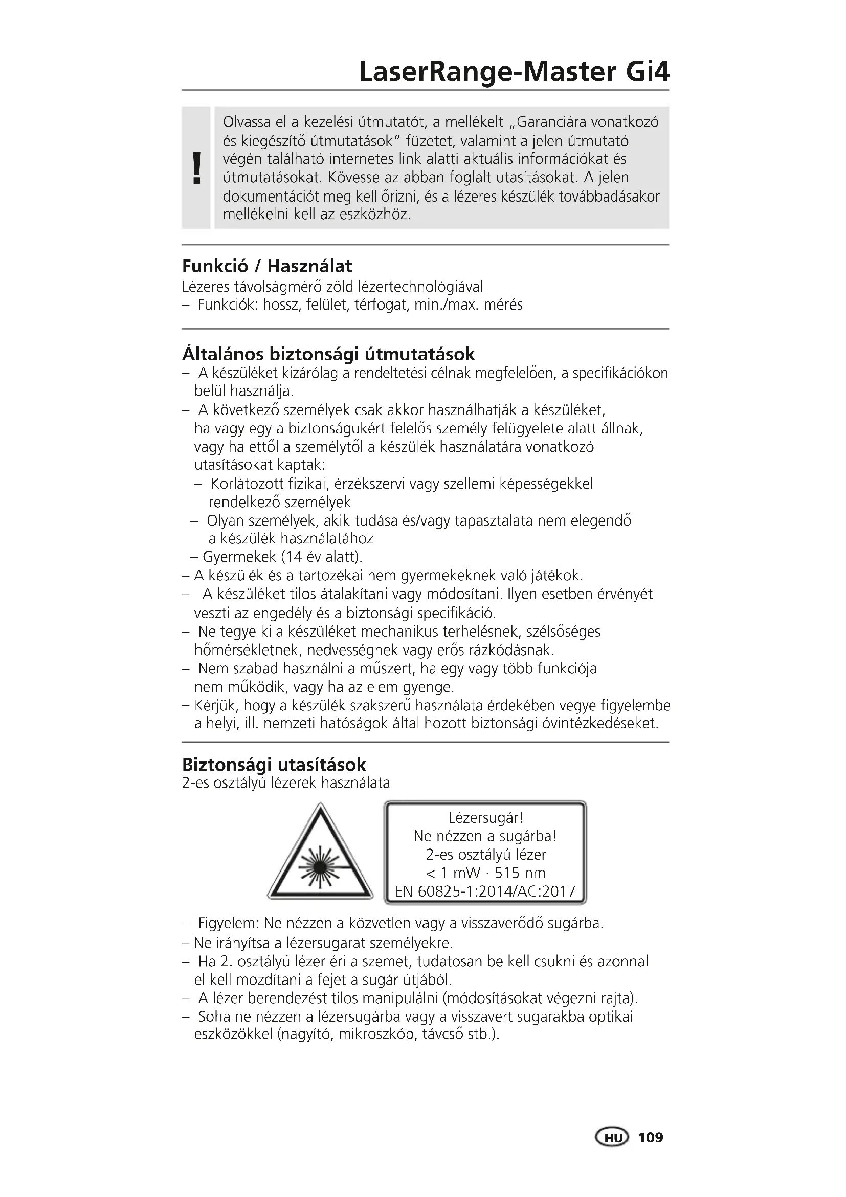 – Figyelem: Ne nézzen a közvetlen vagy a visszaverődő sugárba. – Ne irányítsa a lézersugarat személyekre. – Ha 2. osztályú lézer éri a szemet, tudatosan be kell csukni és azonnal el kell mozdítani a fejet a sugár útjából. – A lézer berendezést tilos manipulálni (módosításokat végezni rajta). – Soha ne nézzen a lézersugárba vagy a visszavert sugarakba optikai eszközökkel (nagyító, mikroszkóp, távcső stb.). Lézersugár! Ne nézzen a sugárba! 2-es osztályú lézer < 1 mW · 515 nm EN 60825-1:2014/AC:2017 Biztonsági utasítások 2-es osztályú lézerek használata Általános biztonsági útmutatások