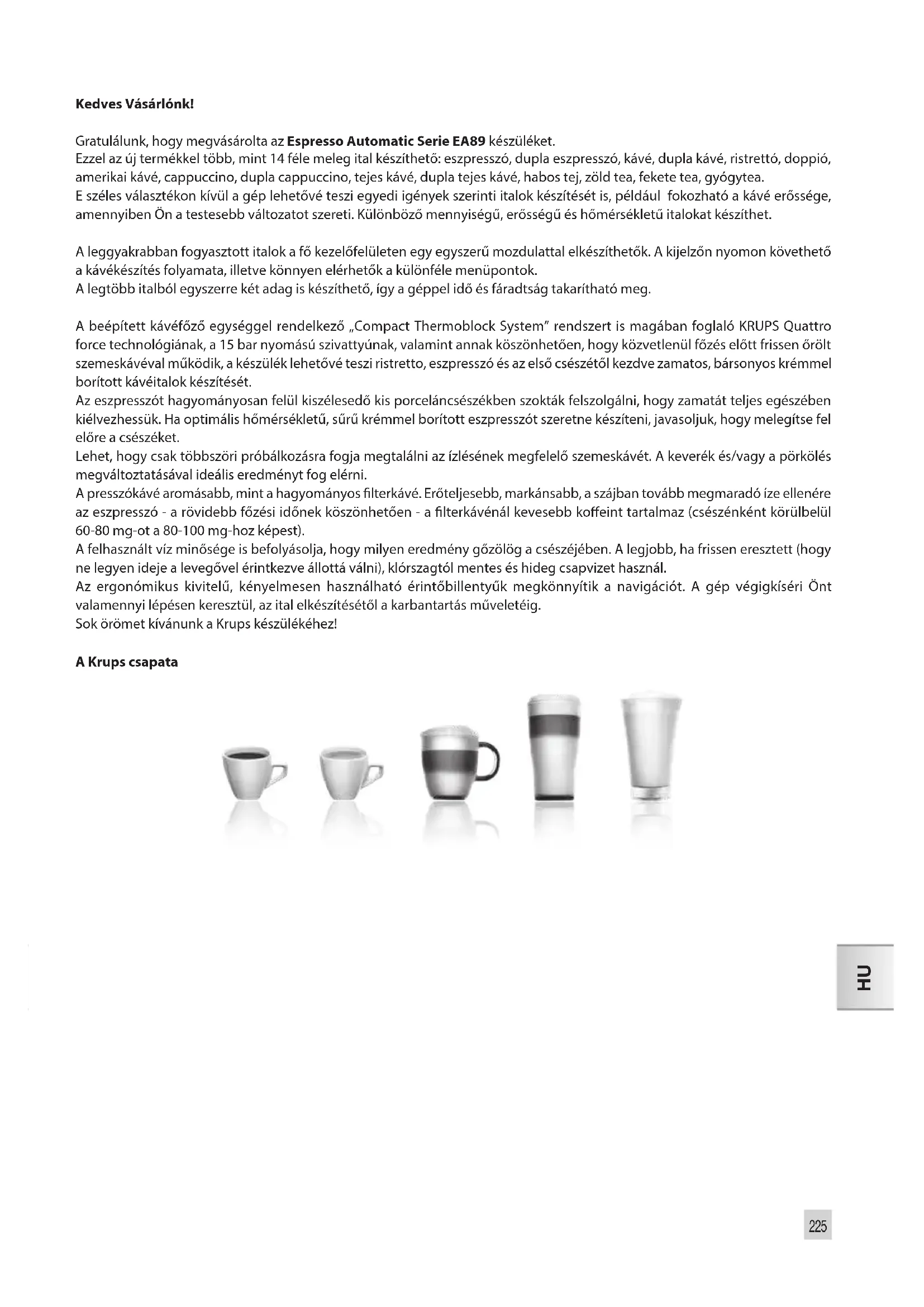 Kedves Vásárlónk! Gratulálunk, hogy megvásárolta az Espresso Automatic Serie EA89 készüléket. Ezzel az új termékkel több, mint 14 féle meleg ital készíthető: eszpresszó, dupla eszpresszó, kávé, dupla kávé, ristrettó, doppió, amerikai kávé, cappuccino, dupla cappuccino, tejes kávé, dupla tejes kávé, habos tej, zöld tea, fekete tea, gyógytea. E széles választékon kívül a gép lehetővé teszi egyedi igények szerinti italok készítését is, például fokozható a kávé erőssége, amennyiben Ön a testesebb változatot szereti. Különböző mennyiségű, erősségű és hőmérsékletű italokat készíthet. A leggyakrabban fogyasztott italok a fő kezelőfelületen egy egyszerű mozdulattal elkészíthetők. A kijelzőn nyomon követhető a kávékészítés folyamata, illetve könnyen elérhetők a különféle menüpontok. A legtöbb italból egyszerre két adag is készíthető, így a géppel idő és fáradtság takarítható meg. A beépített kávéfőző egységgel rendelkező „Compact Thermoblock System” rendszert is magában foglaló KRUPS Quattro force technológiának, a 15 bar nyomású szivattyúnak, valamint annak köszönhetően, hogy közvetlenül főzés előtt frissen őrölt szemeskávéval működik, a készülék lehetővé teszi ristretto, eszpresszó és az első csészétől kezdve zamatos, bársonyos krémmel borított kávéitalok készítését. Az eszpresszót hagyományosan felül kiszélesedő kis porceláncsészékben szokták felszolgálni, hogy zamatát teljes egészében kiélvezhessük. Ha optimális hőmérsékletű, sűrű krémmel borított eszpresszót szeretne készíteni, javasoljuk, hogy melegítse fel előre a csészéket. Lehet, hogy csak többszöri próbálkozásra fogja megtalálni az ízlésének megfelelő szemeskávét. A keverék és/vagy a pörkölés megváltoztatásával ideális eredményt fog elérni. A presszókávé aromásabb, mint a hagyományos lterkávé. Erőteljesebb, markánsabb, a szájban tovább megmaradó íze ellenére az eszpresszó - a rövidebb főzési időnek köszönhetően - a lterkávénál kevesebb koeint tartalmaz (csészénként körülbelül 60-80 mg-ot a 80-100 mg-hoz képest). A felhasznált víz minősége is befolyásolja, hogy milyen eredmény gőzölög a csészéjében. A legjobb, ha frissen eresztett (hogy ne legyen ideje a levegővel érintkezve állottá válni), klórszagtól mentes és hideg csapvizet használ. Az ergonómikus kivitelű, kényelmesen használható érintőbillentyűk megkönnyítik a navigációt. A gép végigkíséri Önt valamennyi lépésen keresztül, az ital elkészítésétől a karbantartás műveletéig. Sok örömet kívánunk a Krups készülékéhez! A Krups csapata227