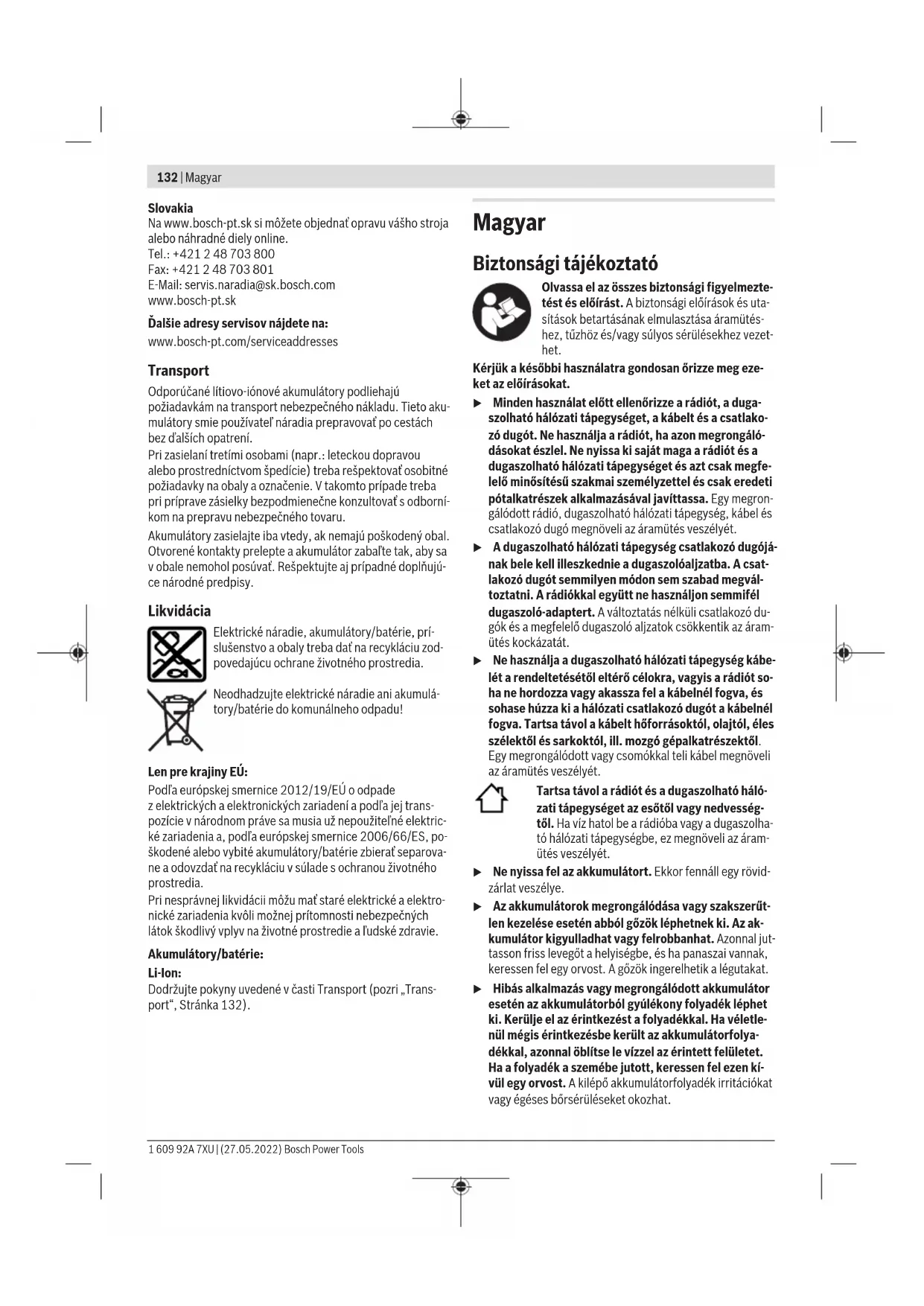 További műszaki adatok az alábbi címen találhatók: https://www.bosch-professional.com/ecodesign 1 609 92A 7XU | (27.05.2022) Bosch Power ToolsMagyar | 135 A rádió energiaellátása A rádió energiaellátását egy (17)Li-ion akkumulátorral vagy a (20)dugaszolható hálózati tápegységgel lehet biztosítani. Üzemeltetés az akkumulátorral u Csak a Műszaki Adatoknál megadott töltőkészüléke- ket használja. Csak ezek a töltőkészülékek vannak ponto- san beállítva az Ön rádiójában használható lítium-ion ak- kumulátorok töltésére. Figyelem: Az Ön rádiójának nem megfelelő akkumulátorok használata működési hibákhoz vagy a rádió megrongálódá- sához vezethet. A lithium-ionos-akkumulátort az "Electronic Cell Protection (ECP)" védi a túl erős kisülés ellen. Ha az akkumulátor kime- rült, a rádiót egy védőkapcsoló kikapcsolja. u Ne kapcsolja be ismét a rádiót, miután azt a biztonsági védőkapcsolás lekapcsolta. Ez megrongálhatja az akku- mulátort. Az akkumulátor kicserélése Nyissa ki az akkumulátor fedél (13)reteszelőkarját és hajtsa fel a (12)akkumulátor fedelet. Az akkumulátor kivételéhez nyomja meg az akkumulátoron található (16)reteszelésfeloldó gombot és húzza ki az akku- mulátort az akkumulátor-kosárból. Ne erőltesse a kihúzást. Az akkumulátor behelyezéséhez tolja azt be úgy a (14)akkumulátor kosárba, hogy az akkumulátor csatlakozói az akkumulátor kosár csatlakozóira feküdjenek. Pattintsa be az akkumulátort. Zárja be és reteszelje a (12)akkumulátor fedelet. Akkumulátor töltöttségi szint kijelző A készülékbe behelyezett akkumulátor esetén a (17)akkumulátor feltöltési szintjét a kijelzőn lehet leolvasni, ha az akkumulátor nincs benne a készülékben, akkor pedig magán az akkumulátoron. Akkumulátor feltöltési kijelzés a kijelzőn A kijelzőn a (i)akkumulátor feltöltési szintjelző display azon- nal megjelenik, mihelyt egy kielégítő feszültségű akkumulá- tort behelyeznek a készülékbe és a rádió nincs a (20)dugaszolható hálózati tápegység segítségével összeköt- ve a villamos hálózattal. Kijelzés Kapacitás 80−100 % 60−80 % 40−60 % 20−40 % 5−20 % 0−5 % Akkumulátor feltöltési szintjelző az akkumulátoron Ha az akkumulátort kiveszi a rádióból, a töltési szintet az ak- kumulátoron elhelyezett feltöltési szintjelző display zöld LED-jein lehet leolvasni. Nyomja meg a vagy a feltöltési szint kijelző gombot, hogy kijelezze a töltési szintet. Ha az akkumulátor feltöltési szint kijelző gomb megnyomása után egy LED sem világít, az akkumulátor meghibásodott és ki kell cserélni. Akkumulátor típus: GBA 18V... LED-ek Kapacitás Tartós fény, 3× zöld 60−100% Tartós fény, 2× zöld 30−60% Tartós fény, 1× zöld 5−30% Villogó fény, 1× zöld 0−5% Akkumulátor típus: ProCORE18V... LED-ek Kapacitás Tartós fény, 5× zöld 80−100 % Tartós fény, 4× zöld 60−80 % Tartós fény, 3× zöld 40−60 % Tartós fény, 2× zöld 20−40 % Tartós fény, 1× zöld 5−20 % Villogó fény, 1× zöld 0−5 % Üzemeltetés dugaszolható hálózati tápegységgel (lásd a Aábrát) u Csak a Műszaki Adatoknál megadott csatlakozó dugós hálózati tápegységeket használja. A rádiót csak így le- het kifogástalanul üzemeltetni. u Ügyeljen a helyes hálózati feszültségre! Az áramforrás feszültségének meg kell egyeznie a dugaszolható hálózati tápegység típustábláján található adatokkal. Nyissa ki a (15)csatlakozófiók védősapkáját. Csatlakoztassa a dugaszolható hálózati tápegység (21)készülék-csatlakozó- dugóját a (22)csatlakozóhüvelyhez (DCIN18V). Csatlakoz- tassa a dugaszolható hálózati tápegységet a villamos hálózat- hoz. A szennyeződések elleni védelemhez ismét zárja le a (15)csatlakozófiók védősapkáját, ha eltávolítja a dugaszol- ható hálózati tápegység(21)csatlakozódugóját. A gombelem kicserélése Az idő tárolásához és a rádión végrehajtott további beállítá- sokhoz a készülékbe pufferelemként be kell tenni egy gomb- elemet. Bosch Power Tools 1 609 92A 7XU | (27.05.2022)136 | Magyar A rádió első üzembe helyezése előtt távolítsa el a behelyezett gombelem védőfóliáját. Nyissa ki az akkumulátor fedél (13)reteszelőkarját és hajtsa fel a (12)akkumulátor fedelet. Szükség esetén vegye ki a(z) (17)akkumulátort. Húzza ki a védőfóliát a gombelem (18)fedele alól. Cserélje ki a gombelemet, ha a rádió már nem tárolja az időt és a kijelző is gyengébbé válik. Ehhez forgassa el a gombelem (18)fedelét az óramutató já- rásával ellenkező irányba (pl. egy pénzérmével) és vegye le a fedelet. Tegyen be egy új gombelemet. Ekkor ügyeljen a gombelem (18)fedelének belső oldalán ta- lálható ábrának megfelelő, helyes polaritás betartására. Tegye ismét fel a helyére a gombelem (18)fedelét és a az óramutató járásával megegyező irányba forgatva rögzítse azt. A fedél csak akkor van biztonságosan reteszelve, ha a je- lölések a fedélen és a lakatszimbólumon egybeesnek. u Vegye ki a rádióból a gombelemet, ha azt hosszabb ideig nem használja. A gombelem a rádióban egy hosz- szabb tárolás során korrodálhat, vagy magától kimerül- het. Üzemeltetés u Óvja meg a rádiót a vízzel való közvetlen érintkezés- től. Ha víz hatol be a rádióba, ez megnöveli az áramütés veszélyét. u Lehetőleg tartsa zárva az akkumulátor fedelét és a csatlakozófiók védősapkáját. A zárt fedelek megóvják a rádiót a víztől és a portól. Audióüzem Be- és kikapcsolás A rádió bekapcsolásához nyomja meg a (2)Be-/Ki-gombot. A (1)kijelző aktiválásra kerül és a rádió legutolsó kikapcsolá- sakor beállított audió forrás kerül lejátszásra. A (1)kijelző minden egyes gombnyomásnál néhány másod- percre kivilágosodik. A rá