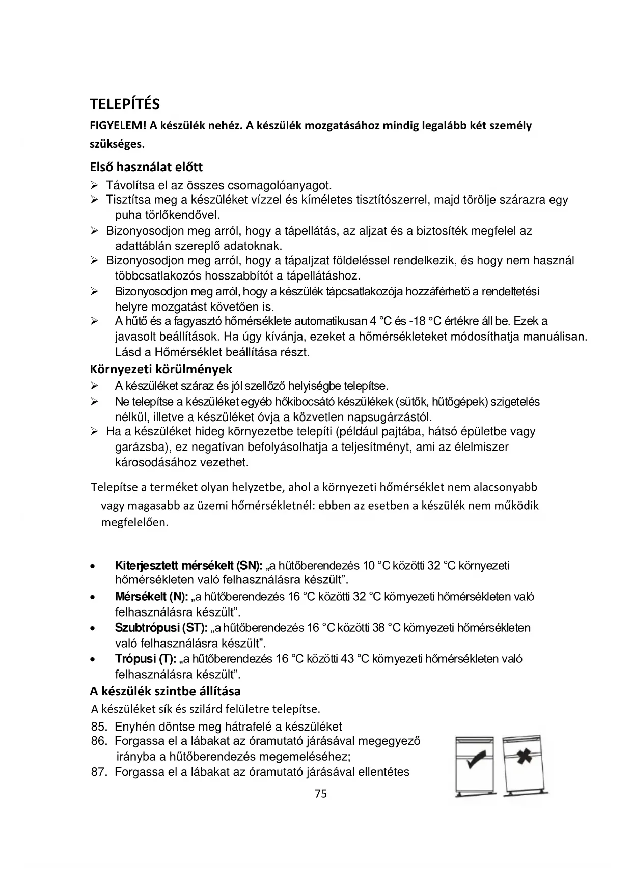 - Trópusi (T): „a hűtőberendezés 16 °C közötti 43 °C környezeti hőmérsékleten való felhasználásra készült”. A készülék szintbe állítása A készüléket sík és szilárd felületre telepítse.