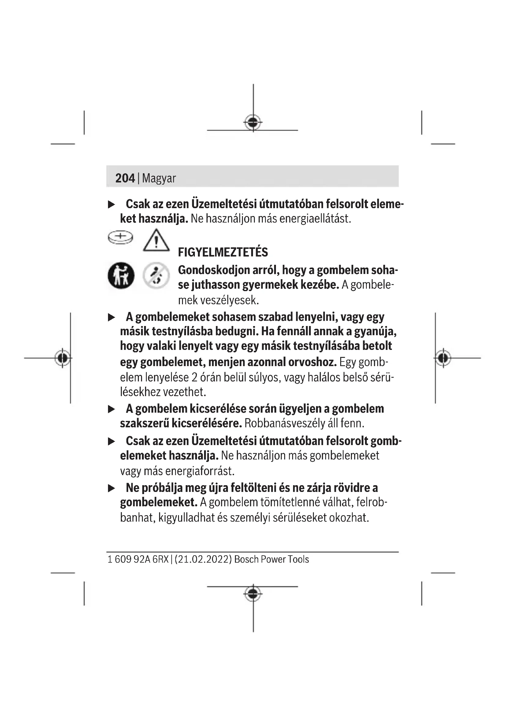 A hatótávolság a külső feltételektől függően, beleértve eb- be az alkalmazásra kerülő vevőkészüléket is, erősen válto- zó lehet. Zárt helyiségekben és fémes akadályok (például falak, polcok, koffer stb.) a Bluetooth®-hatótávolság lé- nyegesen alacsonyabb lehet. 1 609 92A 6RX | (21.02.2022) Bosch Power ToolsMagyar | 209 Rendszerkövetelmények GCY 42 Mobil végberendezés (tab- let, okostelefon) Android6.0 (és újabb verziók) iOS11 (és újabb verziók) Felszerelés és üzemeltetés Energiaellátás u Távolítsa el az elektromos kéziszerszámról, – például egy csavarhúzóval, vagy egy nagyobb pénzérmével, – a Bluetooth® GCY 42 Low Energy Module fedelét. Erre nem alkalmas tárgyak behelyezése esetén az elektronika vagy a fedél megrongálódhat. – A (1) elem megvásárlása vagy kicserélése utáni üzembevé- telhez hajtsa végre az ábrákat tartalmazó oldalon látható műveleteket. Vegye figyelembe az alábbi tájékoztatót. Első üzembe helyezés (lásd a A1–A5 ábrákat) Megjegyzés: Gondosan őrizze meg a GCY 42 (3) vakfedelét. Ha az elektromos kéziszerszámot a GCY 42 nélkül adja tovább, tegye ismét be a vakfedelet. Bosch Power Tools 1 609 92A 6RX | (21.02.2022)210 | Magyar Tegye be az (1) elemet a pozitív pólusával felfelé mutató irányban a (2) GCY 42-be. Az elemet nem kell külön benyomni a helyére; az elem magától nem pattan be. Az elemet a a fedél bezárásakor a tartó az előirányzott helyen rögzíti. A GCY 42 behelyezés utáni inicializálásához használja az elekt- romos kéziszerszám be-/kikapcsolóját. Az elem kicserélése (lásd a B1–B4 ábrákat.) A kimerült (1) elemet csak az ujjaival vegye ki. Mielőtt az elem teljesen kimerülne, az appban egy figyelmezte- tés jelenik meg. A GCY 42 kivétele (lásd a C1–C2 ábrákat) A (2) GCY 42 modul eltávolításához ne alkalmazzon erőszakot. Ne használjon hegyes vagy éles szerszámokat. Megjegyzés: Szükség esetén fordítsa meg az elektromos kézi- szerszámot, hogy könnyebben ki tudja venni a GCY 42-t. Üzembe helyezés Amint behelyezte az (1) elemet és megnyomta az elektromos kéziszerszám be-/kikapcsolóját, a GCY 42 megkezdi egy foly- 1 609 92A 6RX | (21.02.2022) Bosch Power ToolsMagyar | 211 tonos jel kibocsátását. A Bluetooth®-jel csak akkor kerül meg- szakításra, ha az elem kimerült, meghibásodott, vagy kiszerel- ték. További részletes információk közvetlenül a Bosch applikáció- jában találhatók. Az app telepítése és beállítása A GCY 42 használatához először telepítenie kell a Bosch Tool- box appot. – Töltse le a megfelelő Áruházból (Apple App Store, Google Play Store) a Bosch Toolbox appot. Megjegyzés: Itt abból indulunk ki, hogy Önnek van a meg- felelő AppSoter-nál egy felhasználói fiókja. – Válassza ki ezután az appban a MyTools alpontot. – A mobileszköze kijelzőjén megjelenik az összes további lé- pés leírása, amelyre az elektromos kéziszerszám és a mobil- eszköz összekapcsolásához szükség van. Megjegyzés: Először haladjon teljesen végig az applikáció tutoriálján. Így jobban át tudja tekinteni az összekapcsolási el- járást és a konnektivitási funkciók alkalmazását. Bosch Power Tools 1 609 92A 6RX | (21.02.2022)212 | Magyar Adatátvitel Bluetooth®-on A GCY42-nek van egy rendszeres jelküldési intervalluma. A környezettől függően a GCY 42 felismeréséhez több jelküldési intervallumra is szükség lehet. Ha az eszköz nem ismeri fel a GCY 42-t, vizsgálja meg a következőket: – Túl nagy a mobil végberendezés és a modul közötti távol- ság? Csökkentse a mobil végberendezés és a GCY 42 közötti tá- volságot. – Az elem már túl gyenge vagy kimerült? Cserélje ki az elemet. – A mobil végberendezésén kapcsolja ki, majd kapcsolja is- mét be a Bluetooth®-ot. Ellenőrizze, hogy a rendszer most felismeri-e a GCY42-t. Karbantartás és szerviz Karbantartás és tisztítás Egy ecsettel távolítsa el a szennyeződéseket. Tisztító- vagy ol- dószereket ne használjon. 1 609 92A 6RX | (21.02.2022) Bosch Power ToolsMagyar | 213 Vevőszolgálat és alkalmazási tanácsadás A vevőszolgálat a terméke javításával és karbantartásával, va- lamint a pótalkatrészekkel kapcsolatos kérdésekre szívesen válaszol. A pótalkatrészekkel kapcsolatos robbantott ábrák és egyéb információk a következő címen találhatók: www.bosch- pt.com A Bosch Alkalmazási Tanácsadó Team a termékeinkkel és azok tartozékaival kapcsolatos kérdésekben szívesen nyújt segítsé- get. Ha kérdései vannak vagy pótalkatrészeket szeretne rendelni, okvetlenül adja meg a termék típustábláján található 10‑jegyű cikkszámot. Magyarország Robert Bosch Kft. 1103 Budapest Gyömrői út. 120. A www.bosch-pt.hu oldalon online megrendelheti készüléké- nek javítását. Tel.:+3618798502 Fax: +3618798505 info.bsc@hu.bosch.com www.bosch-pt.hu Bosch Power Tools 1 609 92A 6RX | (21.02.2022)214 | Magyar További szerviz-címek itt találhatók: www.bosch-pt.com/serviceaddresses Eltávolítás A GCY 42 moduljait, a tartozékokat és csomagolóanyagokat a környezetvédelmi szempontoknak megfelelően kell újrafel- használásra leadni. Ne dobja ki az elektronikus alkatrészeket és ele- meket a háztartási szemétbe! Csak az EU‑tagországok számára: Az elektromos és elektronikus berendezések hulladékairól szó- ló 2012/19/EU európai irányelvnek és a nemzeti jogba való át- ültetésének megfelelően a már nem használható elektromos kéziszerszámokat és a 2006/66/EK európai irányelvnek meg- felelően a már nem használható akkumulátorokat/elemeket kü- lön össze kell gyűjteni és a környezetvédelmi szempontoknak megfelelően kell újrafelhasználásra leadni. Szakszerűtlen ártalmatlanítás esetén a már használhatatlan elektromos és elektronikus készülékek a bennük esetle